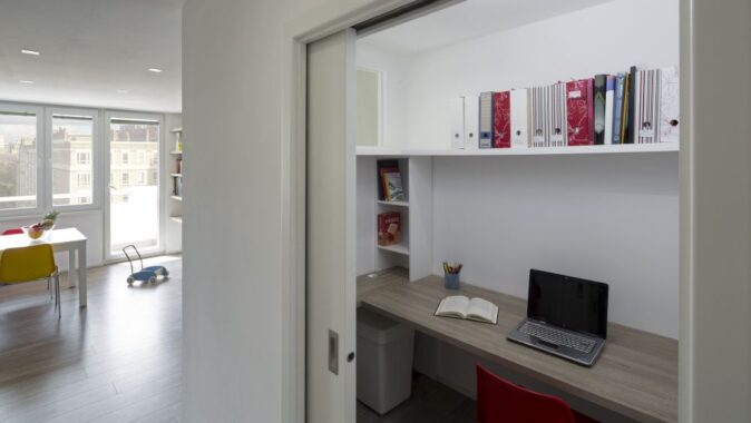 Vzdělaní a podnikaví klienti potřebovali na určité životní období realizovat bydlení s dětmi v momentálně preferované lokalitě. Vhodný byt, jen několik desítek metrů od jejich každodenních cílů, se nacházel v klasickém panelovém domě s typizovanou dispozicí, která prodělala celkovou proměnu. Původní stavební program z dob centrálního hospodářství nepočítal s individuálními požadavky plynoucími z volného pracovního trhu. Částečně živit rodinu nebo řídit firmu z pracovny ve vlastním bytě byla na rýsovacích prknech normalizačních architektů sídlišť utopie. Jenže přesně takovou utopii naši klienti potřebovali. Výsledkem byla zásadní reorganizace provozu bytu a jí přizpůsobený interiér. Samozřejmostí je i samostatná šatna pro ložnici a takový dětský pokoj, aby se děti na stěhování do nového mohly těšit.