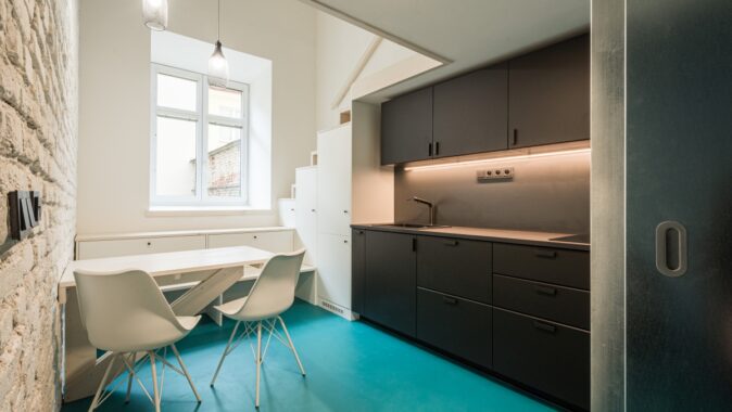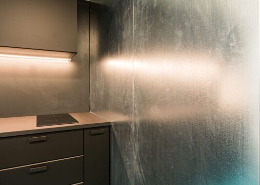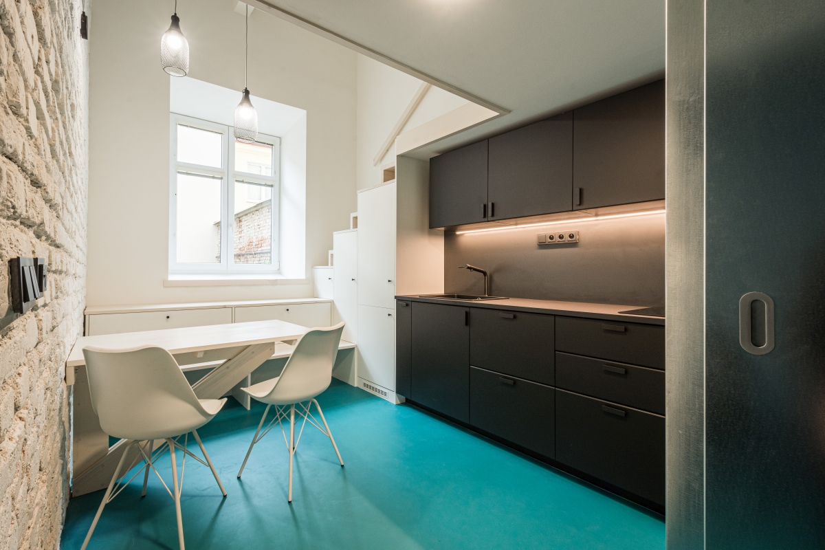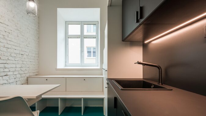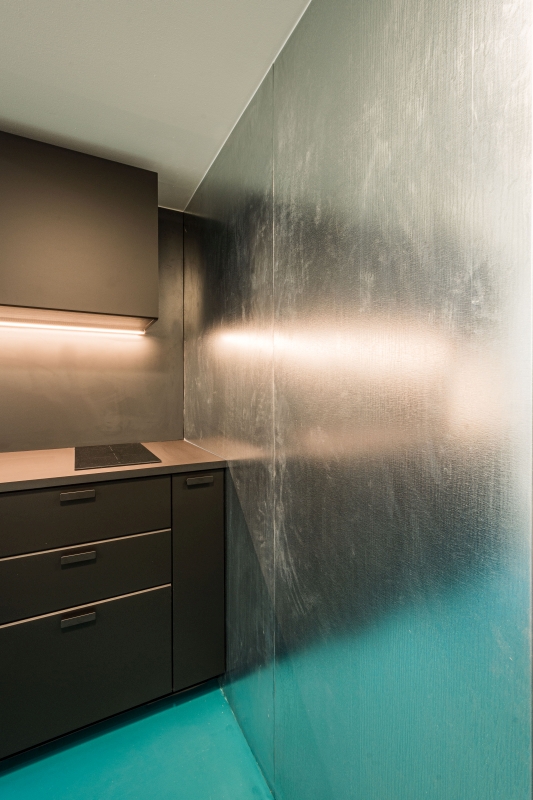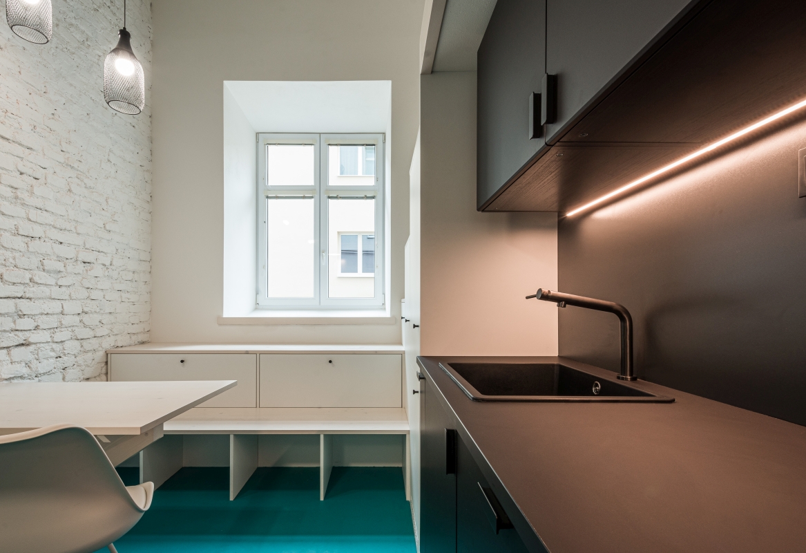 materiálů – pozinkovaného plechu a též černé barvy v rámci kuchyně a sanitárních