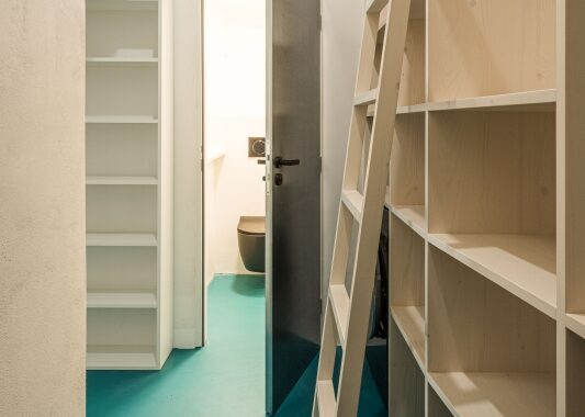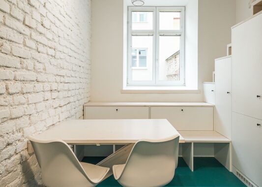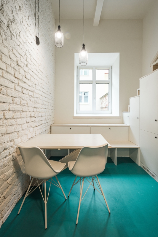 prvků doplněné o textury dřeva a bílé barvy, která umocňuje charakter surových