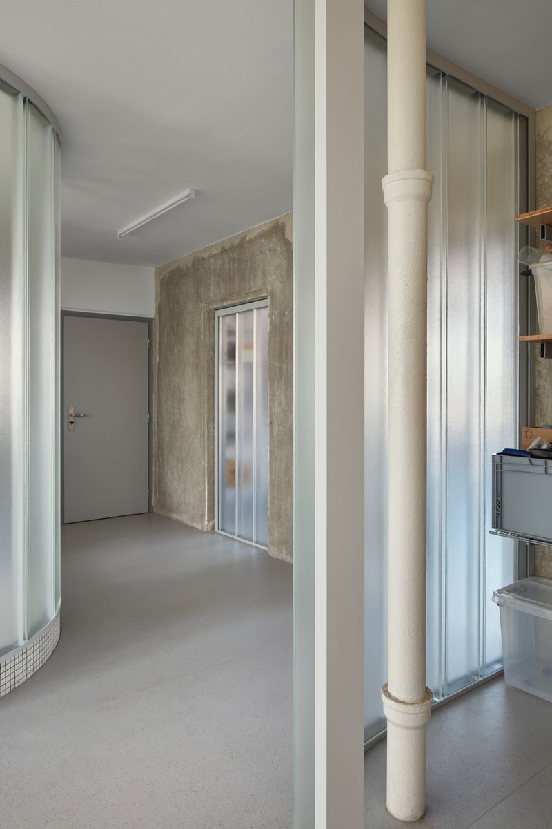 In addition to statics, infrastructure is a key design constraint. The neuralgic point thus becomes the water and sewage connection, which defines the location of the single-almost-enclosed space. The most prominent element is therefore the bathroom arch with toilet and shower. Because of the waste management, it is perched on a small platform that subtly emphasizes its spatial dominance. The plan composition is complemented by three open U-profiled glass curves that unobtrusively define the cloakroom, storage and workspace, in other words the kitchen. The remaining space is freely modulated between these lines of glass and remains open to any future interpretation. We work with our favourite principle, whereby a uniform and unambiguous space forms the background for the life (in this case, above all the work) of its inhabitant. We also work with our second favourite principle, where we remove everything that is not load-bearing and does not break the law.