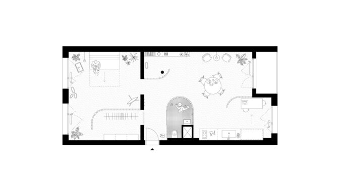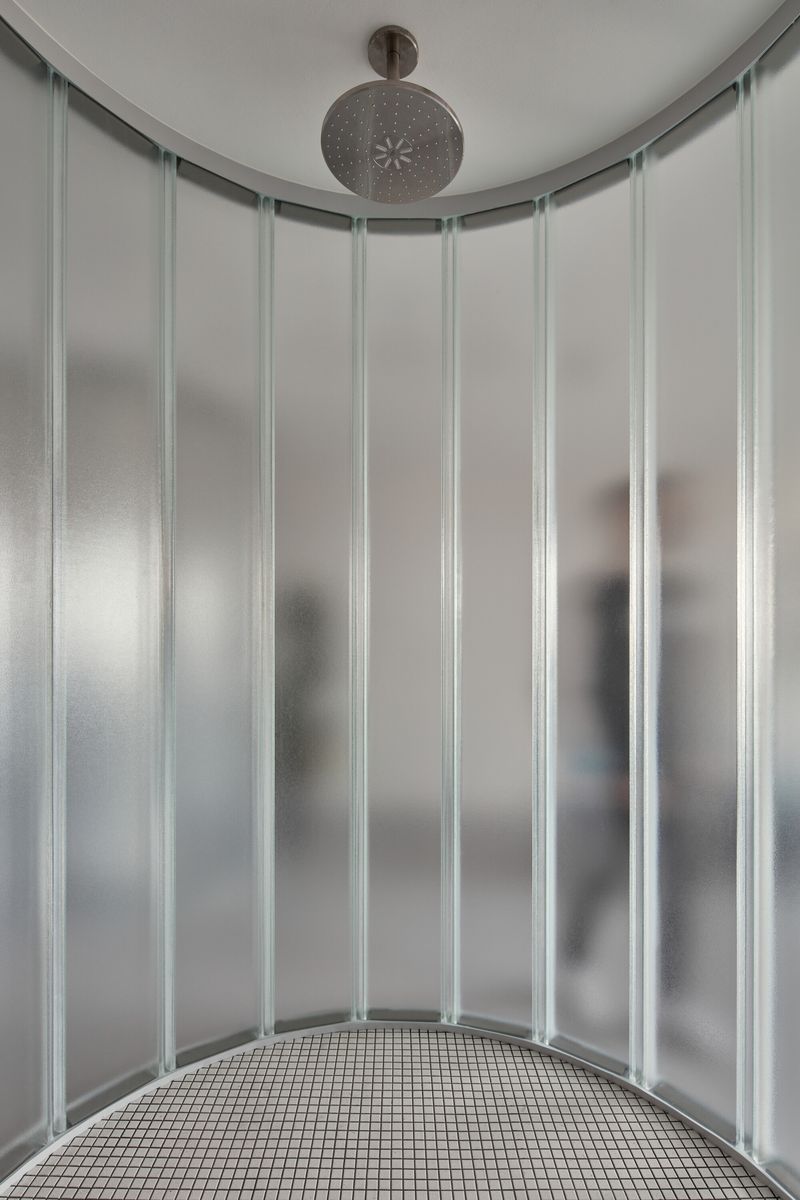 Klíčovým limitem pro návrh je kromě statiky infrastruktura. Neuralgickým bodem se tak stává napojení vody a kanalizace, které definuje umístění jediného-skoro-uzavřeného prostoru. Nejvýraznější prvek proto tvoří koupelnový oblouk s toaletou a sprchou. Kvůli vedení odpadu je usazen na decentní platformě, která jemně podtrhuje jeho prostorovou dominanci. Půdorysnou kompozici doplňují tři otevřené copilitové „hokejky“, které nenásilně vymezují šatnu, sklad a dílnu, jinými slovy kuchyni. Zbylý prostor je volně modulován mezi těmito křivkami skla a zůstává otevřen jakékoli budoucí interpretaci. Pracujeme s naším oblíbeným principem, kdy jednotný a jednoznačný prostor tvoří pozadí pro život (v tomto případě především tvorbu) jeho obyvatele. Pracujeme i s naším druhým oblíbeným principem, kdy odstraňujeme vše, co není nosné a co neporušuje zákon.