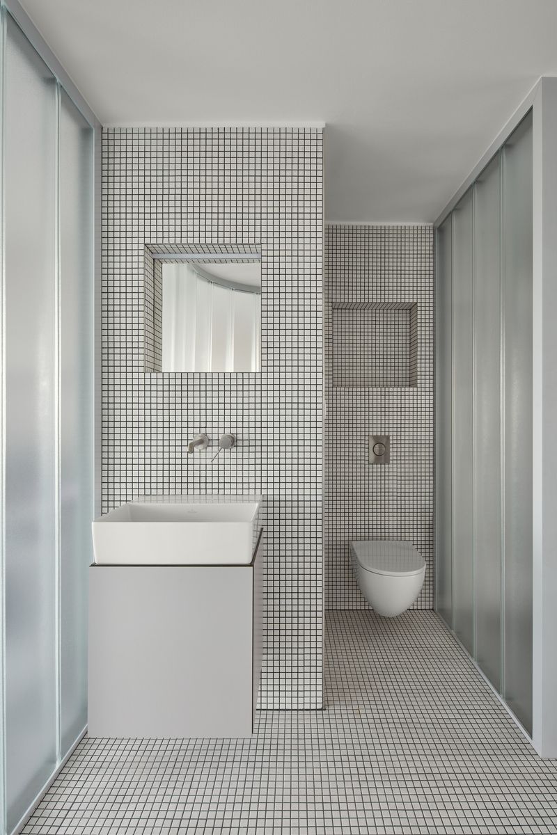 Obdélný půdorys „od okna k oknu“ přetíná železobetonová nosná stěna se dvěma otvory, kterou jsme (díky její výsadní pozici) jako jediný prvek očistili na její materiálovou podstatu a učinili z ní nositelku identity místa. Zbylé stěny a strop naopak ponecháváme v lapidární bílé omítce – nemáme zájem ani přehánět betonovou manýru, ani přesmíru konkurovat elegantnímu sklu či vytvářet příliš sevřený prostor. Místa, kde dochází ke kontaktu s vodou, jsou definována špinavě bílou mozaikou. Velkorysá kuchyně, kde vzniká více objektů než jídel, je formulována technicistním jazykem, aby funkčně vyhovovala svému primárnímu účelu. Charaktery jednotlivých prostorů podtrhuje typ použitých svítidel: přísné linky či rozvolněné bodovky.