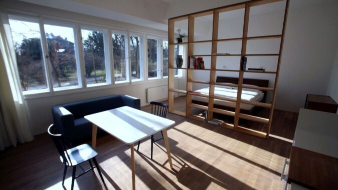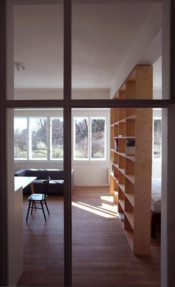 délší strany bytu umožňuje jeho uživatelům výhled do přilehlého parku. Bílé
