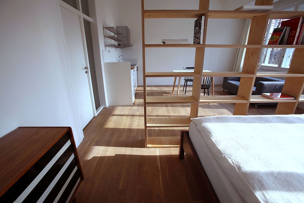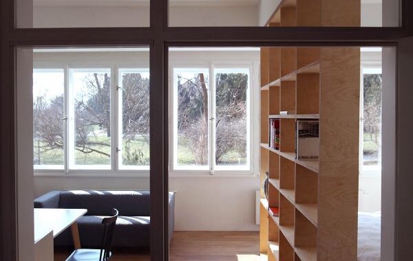 vertkální konstrukce nahradila vložená knihovna vyrobená z březové překližky a