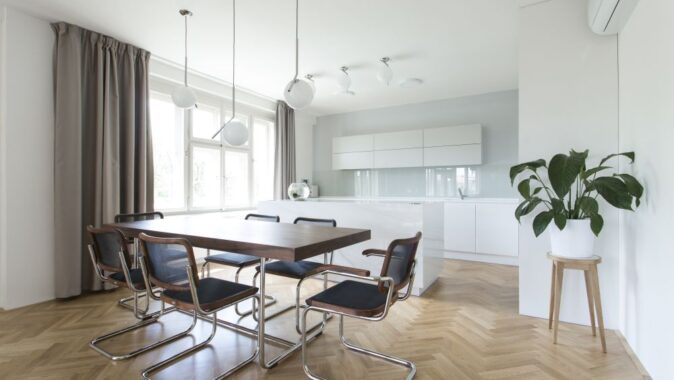 elementů v designu dubového dřeva a bílého laku vytváří kontrast mezi starým a
