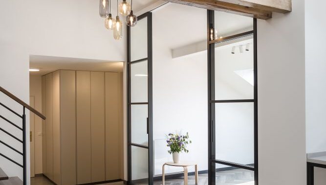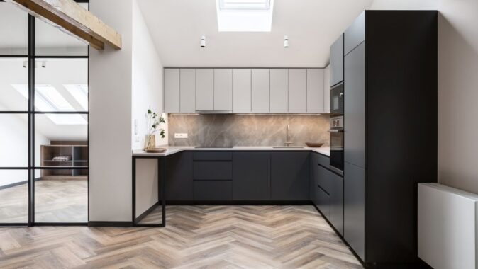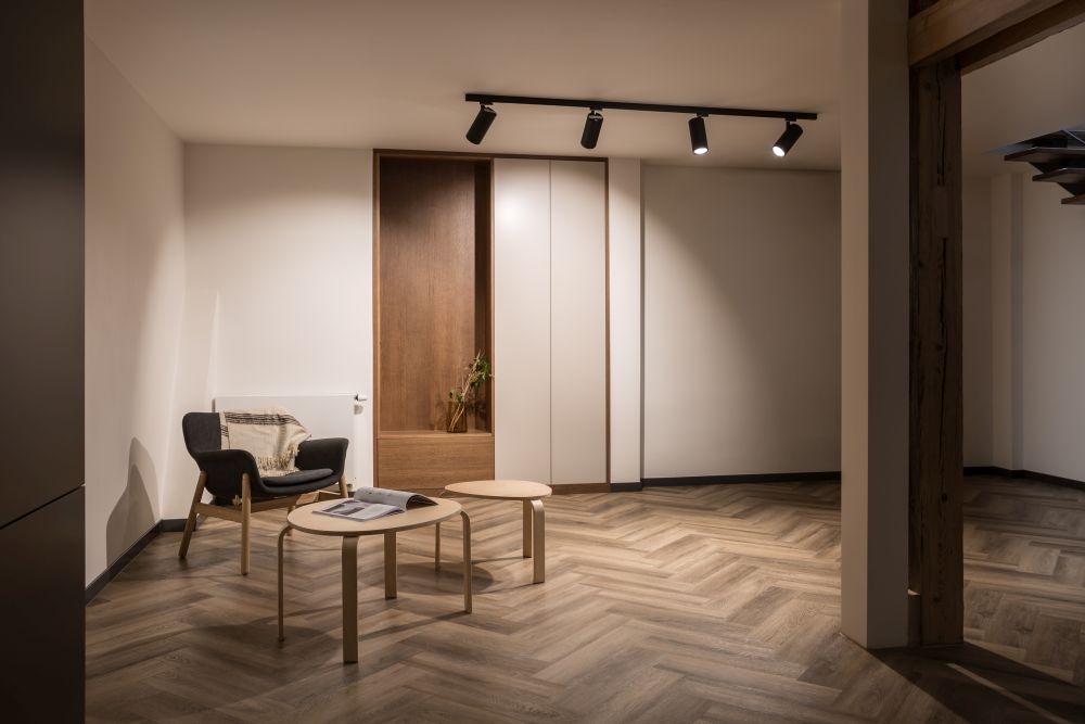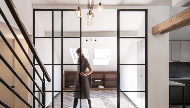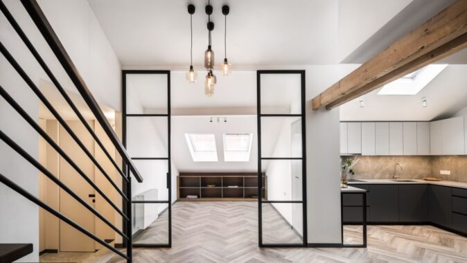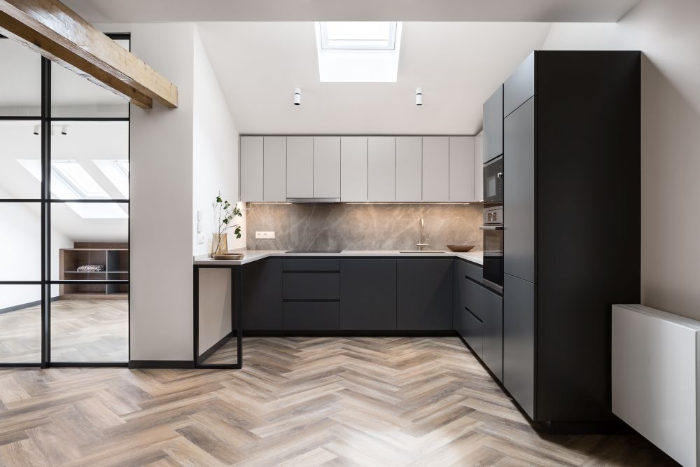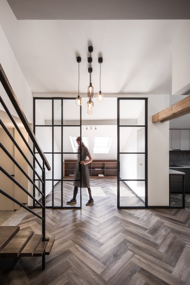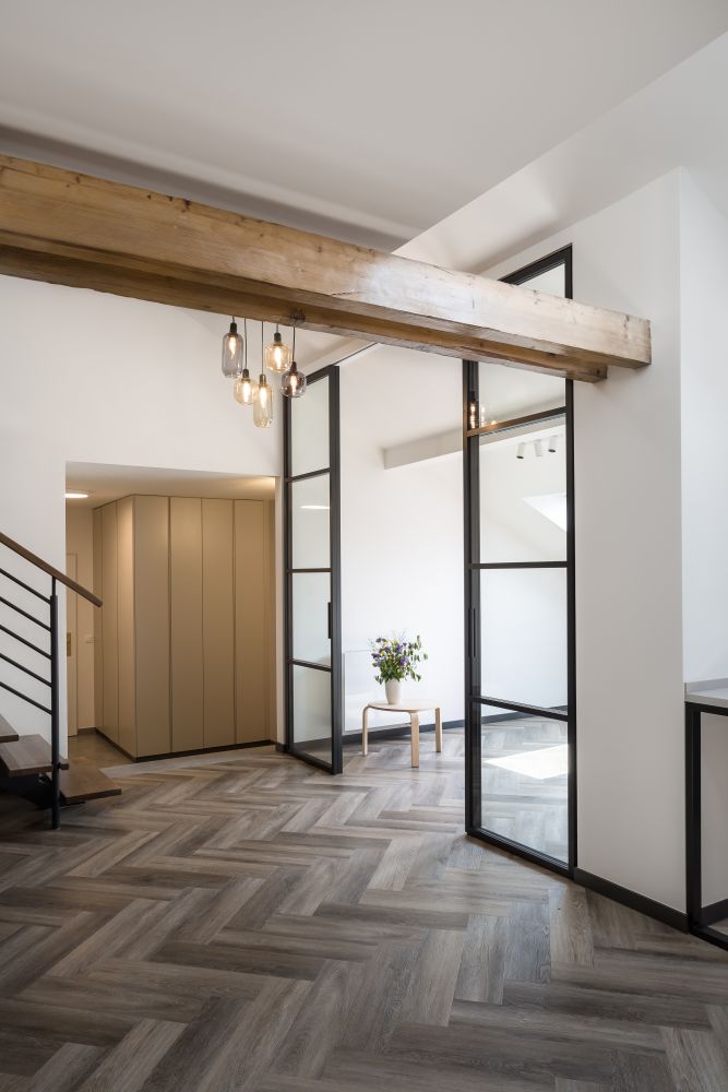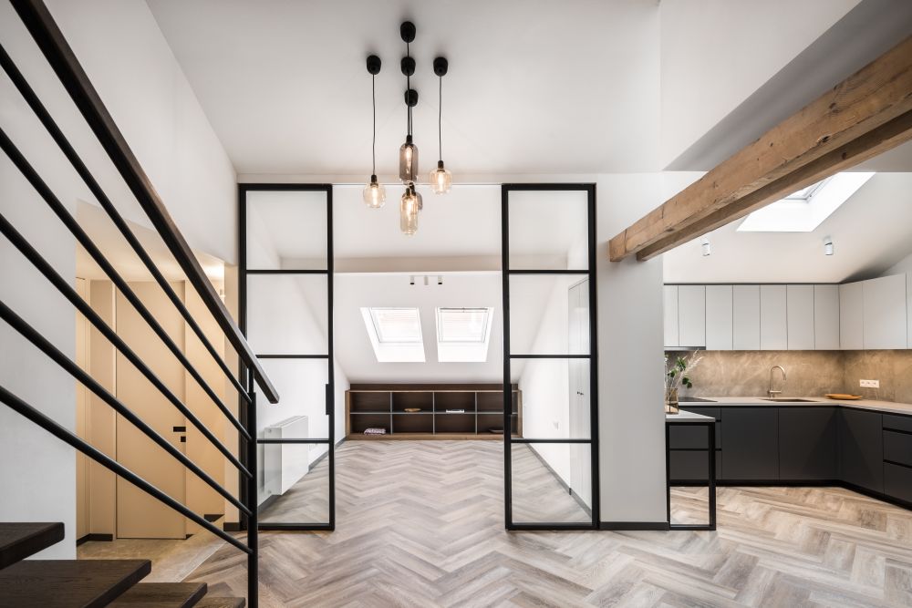 Cílem rekonstrukce mezonetového podkrovního bytu bylo zejména napravit nevhodné stavební úpravy z předešlých let. Chybějícího přirozeného osvětlení v přízemí mezonetu jsme dosáhli díky osazení nového střešního okna v kuchyni a umístěním celoskleněné stěny s posuvnými dveřmi do pokoje při dvorní fasádě. Dalších příjemných změn a provzdušnění jsme docílili pomocí otevření vstupního prostoru do obývací části, odstranění sádrokartonových příček, odhalení dřevěných částí krovu a také volbou barev. Rozhodli jsme se pro kombinaci světlých pastelových barevných odstínů a černé.