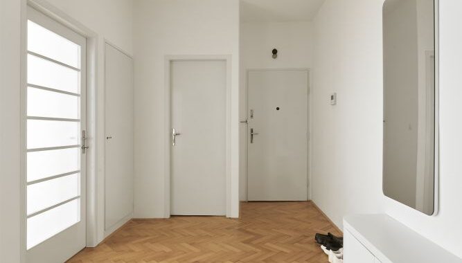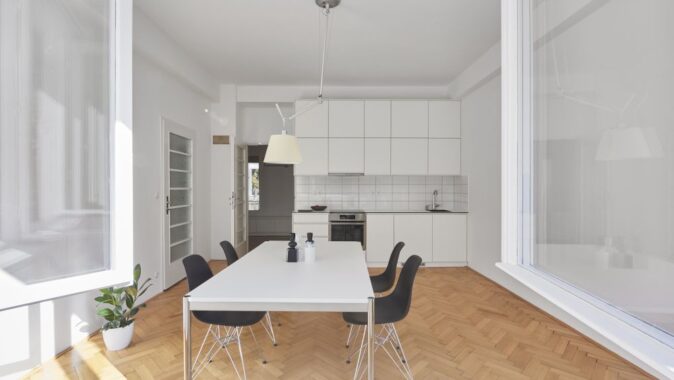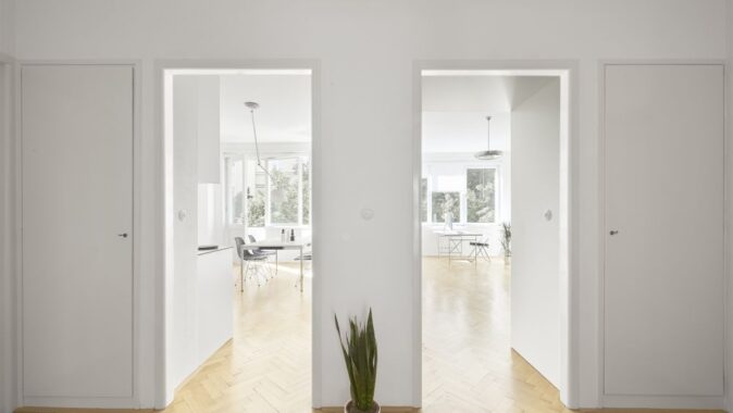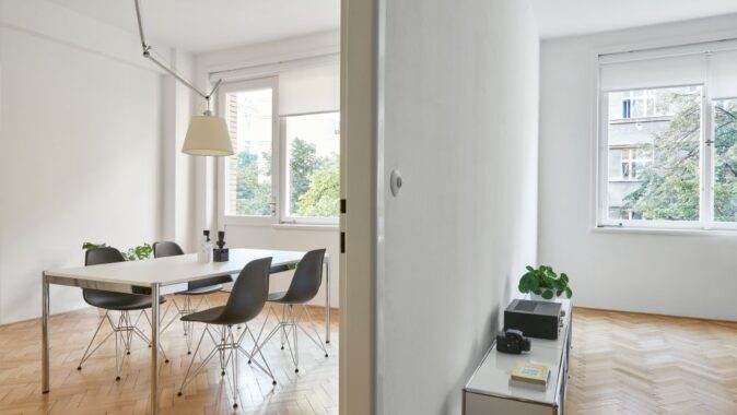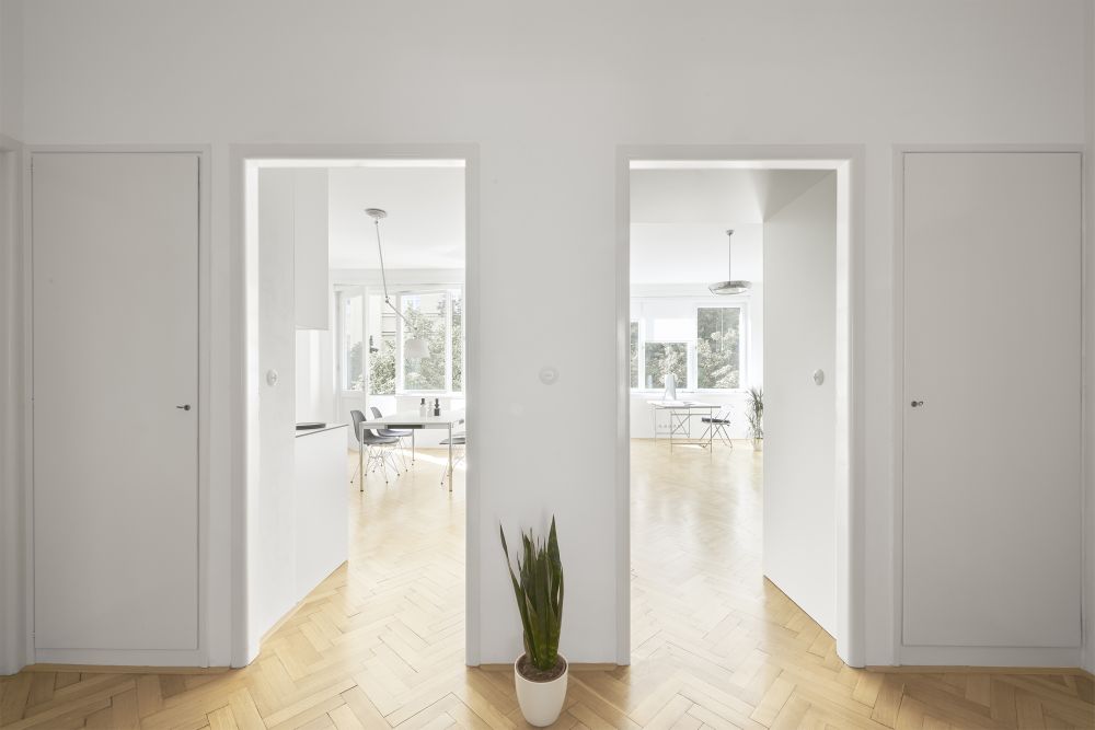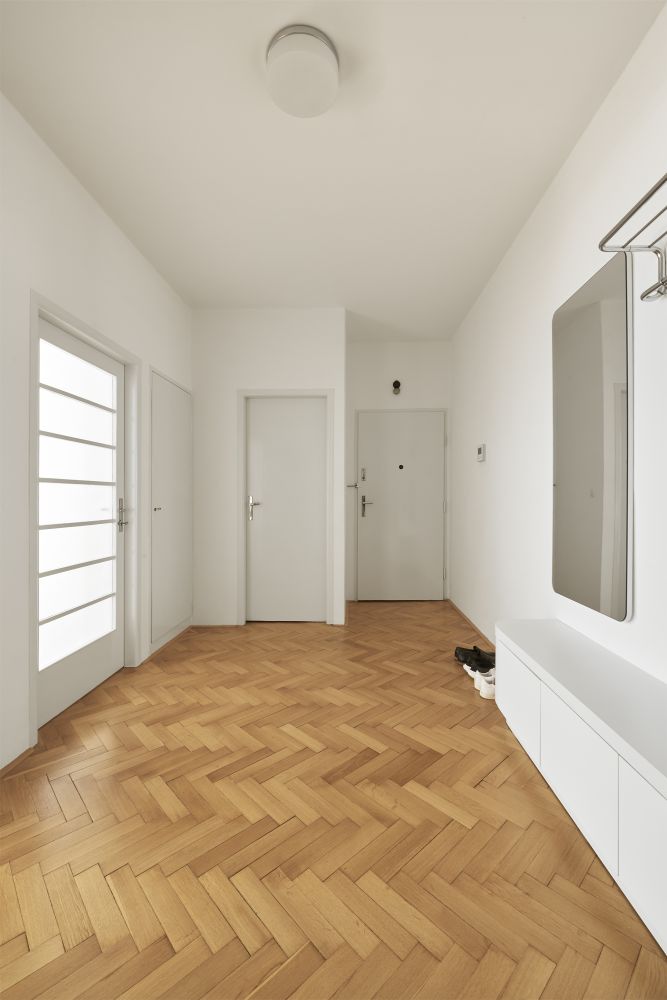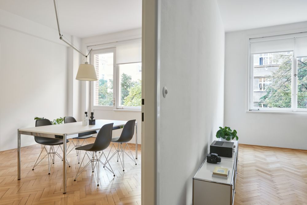 Na počátku spolupráce bylo přání investora žít ve funcionalistickém domě. Ve spolupráci s námi se podařilo byt najít, nachází se v domě od Ing. Františka Troníčka (mimo jiné spoluautora rondokubistické Legiobanky). Dům nebyl od 30. let zásadně rekonstruován, dochovala se tak většina povrchů a detailů. Zadáním investora byla rekonstrukce bytu, který měl být doplněn vestavným nábytkem a přizpůsoben nárokům současného života. Zásadním požadavkem bylo přetvoření dispozice z dvoupokojového bytu s kuchyní na třípokojový s obytnou kuchyní. Kuchyně byla původně v severní části dispozice. Podařilo se ji přesunout do většího jižního prostoru, navázaného na lodžii. V místnosti s repasovanou xylolitovou podlahou, orientované do klidného vnitrobloku, je ložnice s vestavnými skříněmi. Všechny místnosti jsou přístupné z prosvětlené vstupní haly. Do ní jsme navrhli botník s odkládacím prostorem, dále tu jsou původní vestavné skříně. Světlo sem dopadá přes prosklené dveře kuchyně a obývacího pokoje. Všechny dveře a okna jsme obnovili, skleněné tabule ve dveřích jsou doplněny novými skly zpracovanými podle dobové technologie. Na halu navazují menší obslužné místnosti, například bývalý pokoj pro služku, umístěný uprostřed dispozice a prosvětlený pouze oknem na chodbu domu. V této místnosti je nyní šatna. V koupelně jsme použili jednotné bílé obklady, které svým rozměrem 15 x 30 cm odkazují k původním opaxitovým obkladům. Drobná mozaika dlažby zase odkazuje k původní dlažbě. Vše akcentují antracitové spáry.