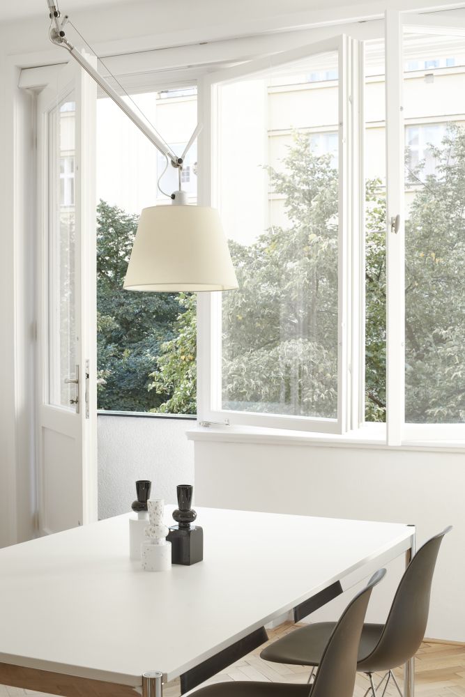 Obytná část orientovaná na jih se skládá ze dvou pokojů. Důraz jsme kladli na čistotu provedení a funkčnost. Rastr objevující se v členění kuchyně i obkladu nad pracovní plochou odkazuje na technickou přísnost a řád, typický pro budovy a interiéry z období funkcionalismu. V obývacím pokoji je navržena knihovna, další vybavení tvoří současný nábytek a dobový konferenční stolek z ohýbaných trubek.