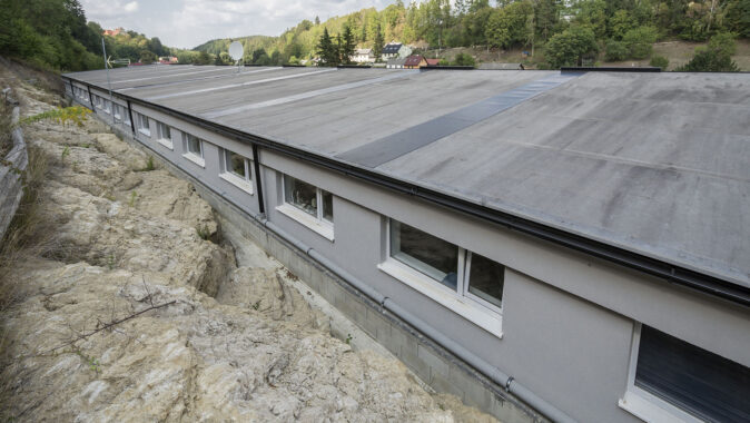 domem. V levé části objektu je do svahu zapuštěná obchodní plocha a v pravé