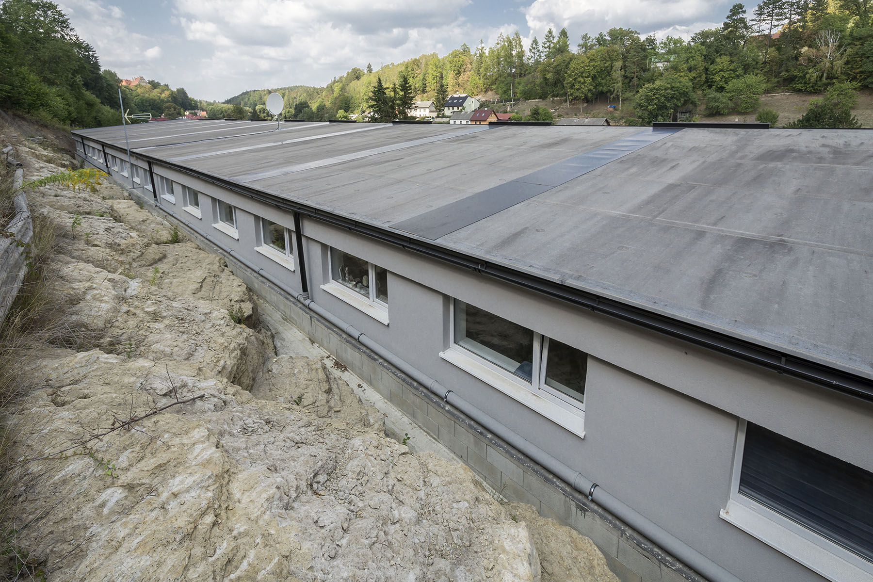 podlaží. Bytový dům stojí v prudkém skalnatém svahu, o který se opírá.