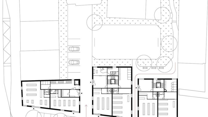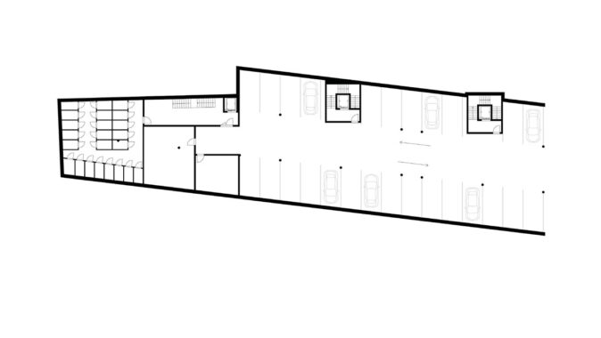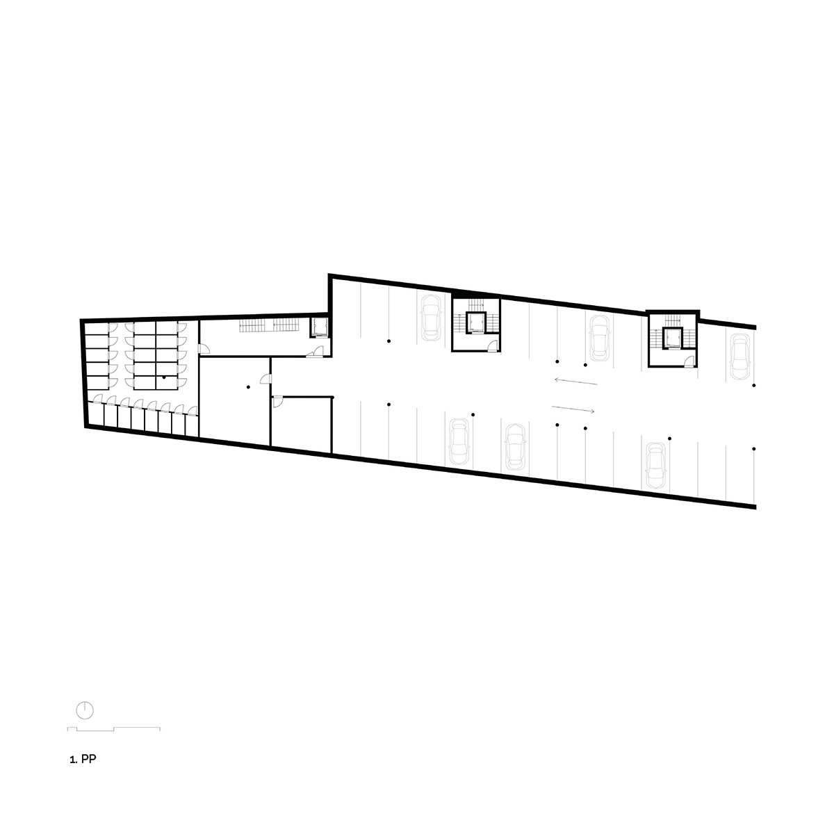 i s vedlejším bytovým domem v ulici. Vjezd do podzemních garáží je umístěn v ulici Pod radnicí. Kromě parkovacích stání se v suterénu nachází rovněž sklepy a technické místnosti, určené pro odpad a vytápění.