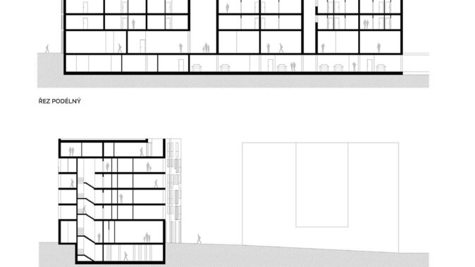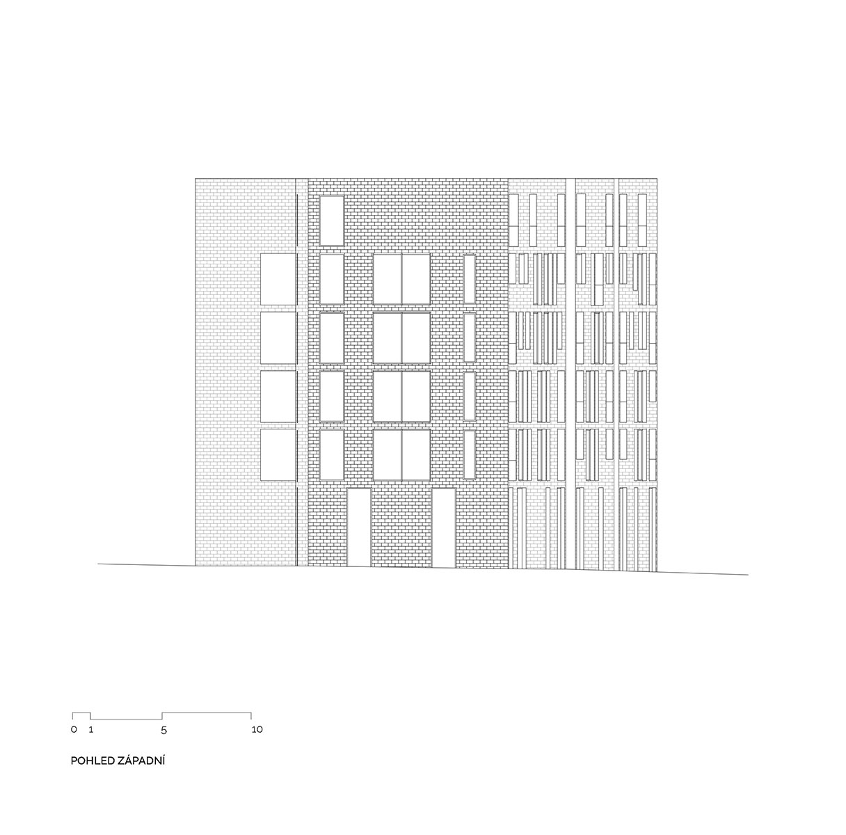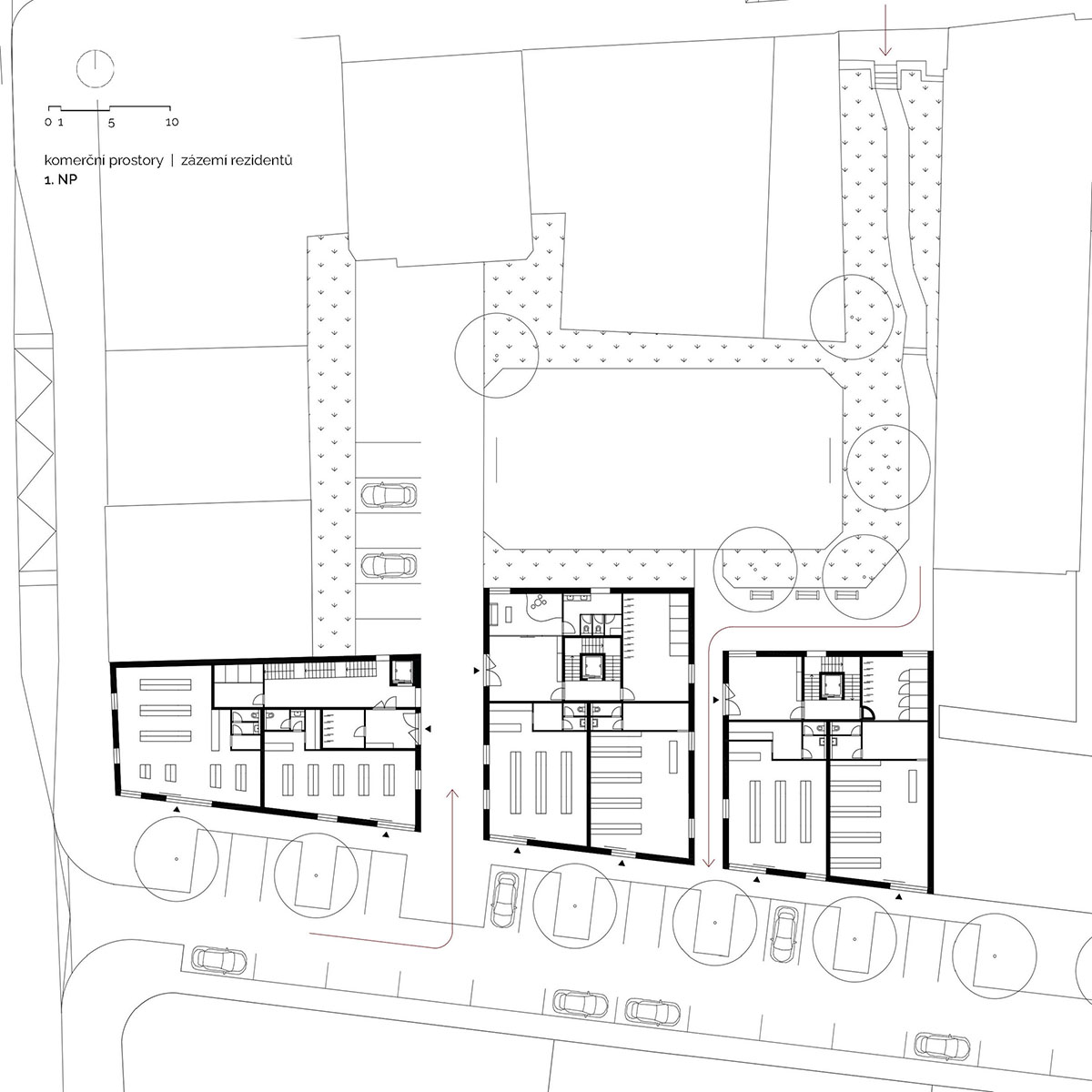 V parteru se nachází pronajímatelné komerční prostory, přístupné z Hlaváčkovy ulice, a zázemí pro rezidenty. Ve vyšších patrech jsou rozmístěné byty různých velikostí. Ve druhém, třetím a čtvrtém patře navrhuji šest 2KK bytů, jeden 3KK a dva 4KK. Dohromady tedy celkem devět bytů na jedno podlaží. V pátém a šestém podlaží navrhuji byty mezonetové, které mají přístup na střešní terasu.