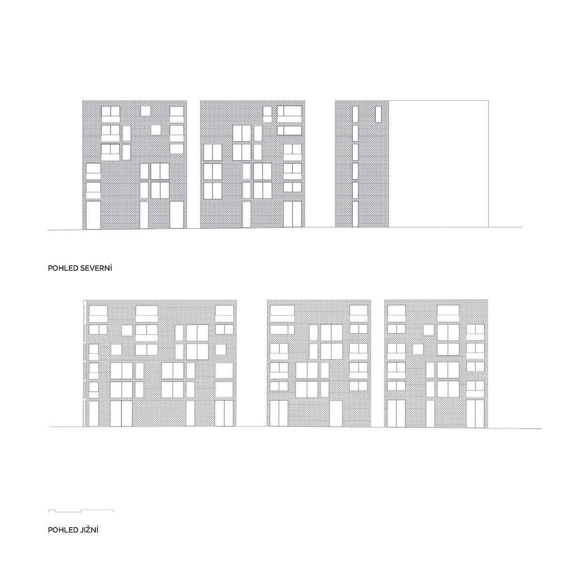 Co se týče materiálů, na jižní a severní fasádě dominuje černé režné zdivo, které spolu s rozměrnými okenními otvory a lodžiemi tvoří dynamický pohled. Vnitřní stěny lodžií zůstavají světlé. Šedý pohledový beton pokrývá boční stěny bytových domů. Kontrastuje tak s tmavou uliční fasádou, která by v užších částech mezi domy netvořila vhodnou atmostféru. Dlažební kámen s geometrickou skladbou  vyplňuje prostor před bytovými domy. Tvoří tak reprezentativní část komunikace v Hlaváčkově ulici.