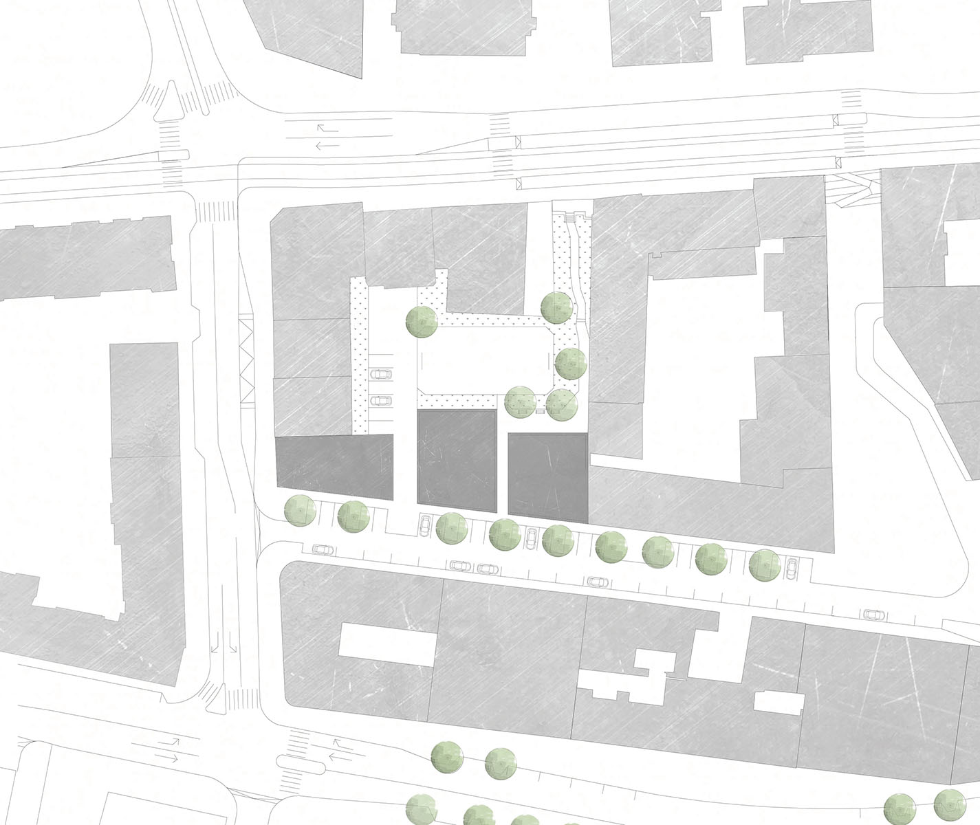Nezastavěné Hlaváčkově ulici přiléhají nevyužité plochy, které vytváří nefunkční přostředí, bloková zástavba z Plzeňské a Prachnerově ulice zde nepokračuje. Právě tuto skutečnost se ve svém projektu pokouším změnit. Dlouhá, šedesátimetrová, proluka v Hlaváčkově ulici vybízela k rozdělení hmoty na více částí. S ohledem  na měřítko a na zástavbu v Plzeňské ulici jsem se rozhodla vytvořit hmoty tři. Rozhodujícím faktorem však bylo zachodávní vjezdu a parkovaní ve dvoře, čehož obytvaleté okolní zástavby v současné době využívají, a průchodu vnitroblokem z ulice Plzeňská do Hlaváčkovy ulice. Dalším cílem bylo