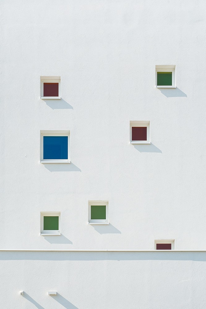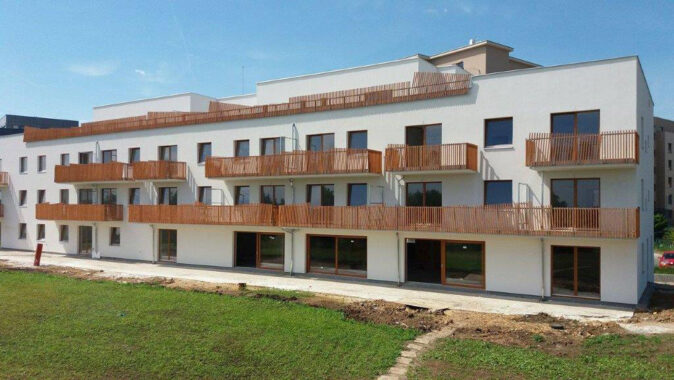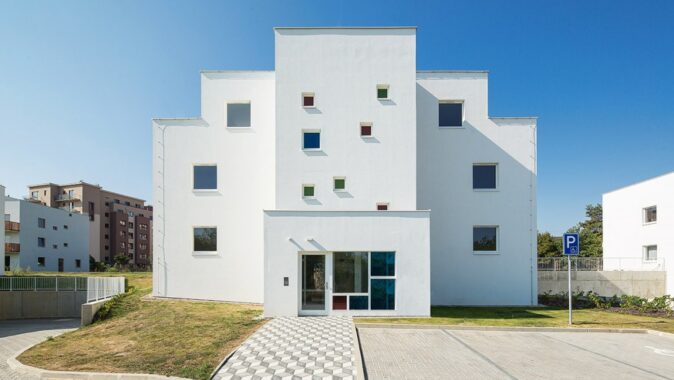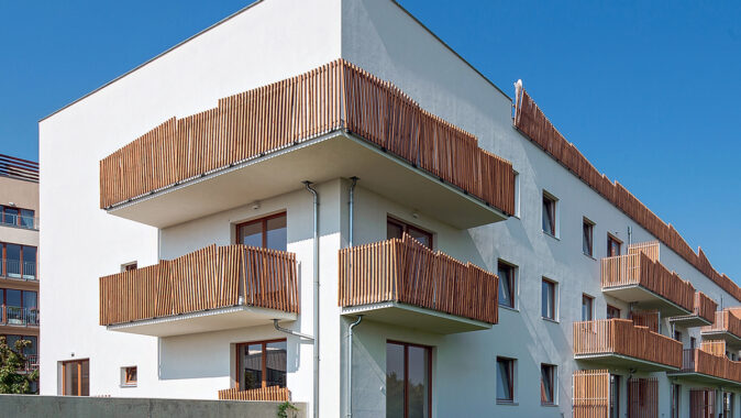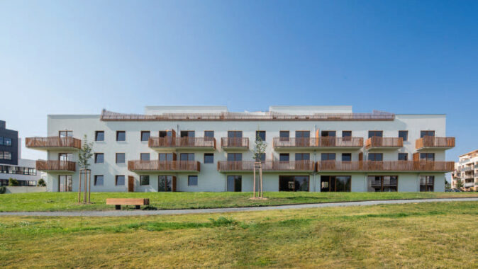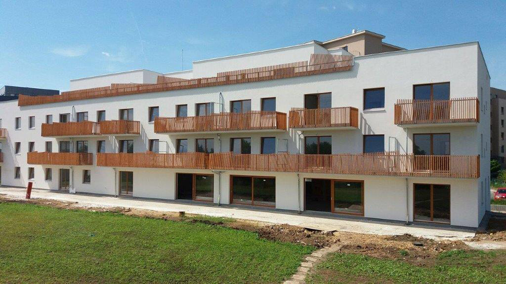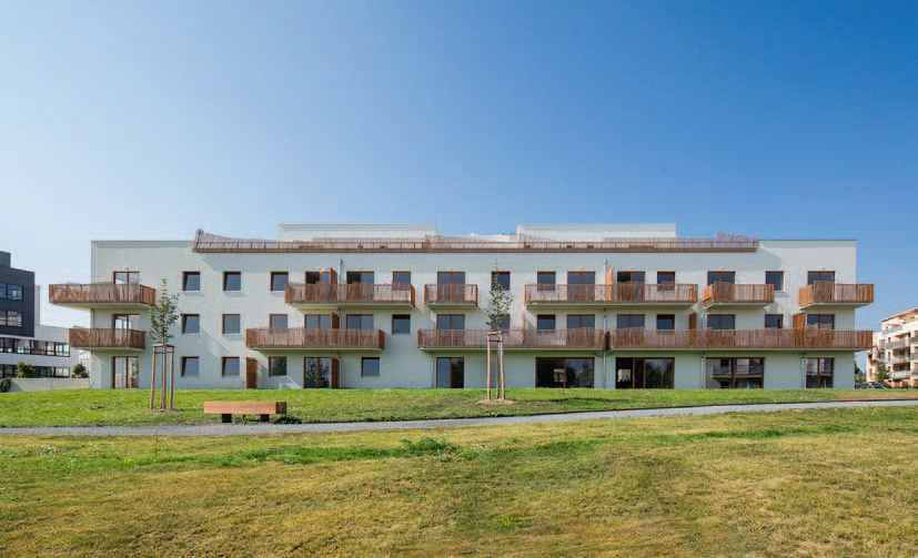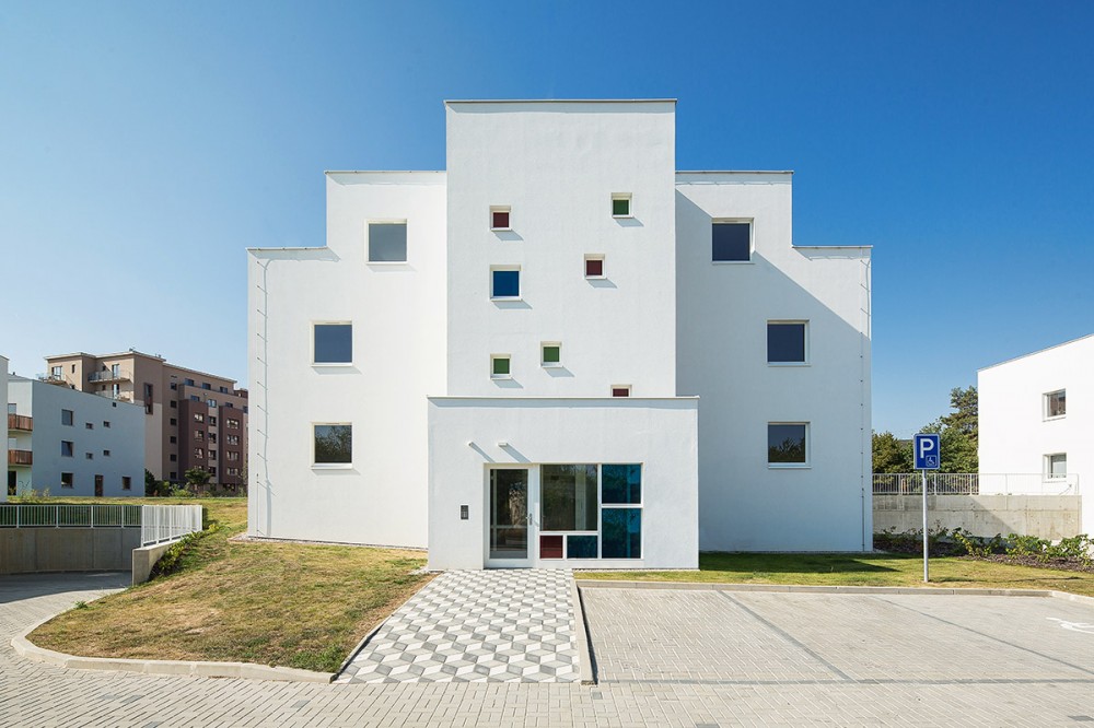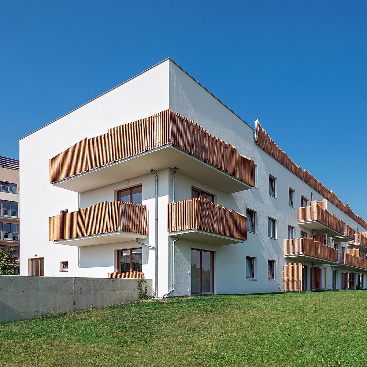 Bytový dům má jednoduchý obdélníkový půdorys. Ve střední části je hranol hmoty vyvýšeno ustupující patro – na střeše je umístěn jeden penthouse se dvěma bytovými jednotkami a dělícím atriem. Na západní straně hladkou hmotu fasády dělí objemy vstupů a zádveří. Okna na fasádě mají strohý, geometrický rastr. Jednotlivé vstupy odlišuje rastr dřevěných prvků, kterými jsou obloženy kubusy zádveří.Východní strana je více strukturální – dělí ji nepravidelný rastr oken různých formátů a prostorové hmoty balkonů. Severní fasáda je jen velmi jednoduchá. Potenciál jižní orientace dal vzniknout dlouhým balkonům na jižní fasádě. Od jihu vede přístupová rampa do garáží. Nosným výtvarným prvkem jinak jednoduché a čisté fasády je zábradlí tvořené mořenými modřínovými laťkami na ocelové konstrukci, jejichž sklon se v nepravidelných intervalech mění.