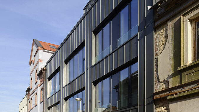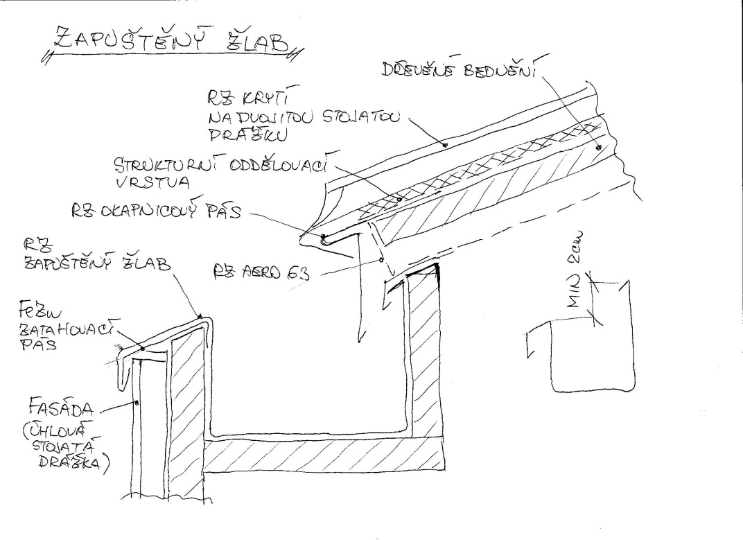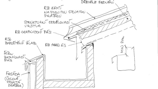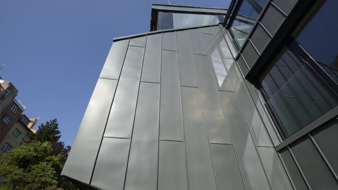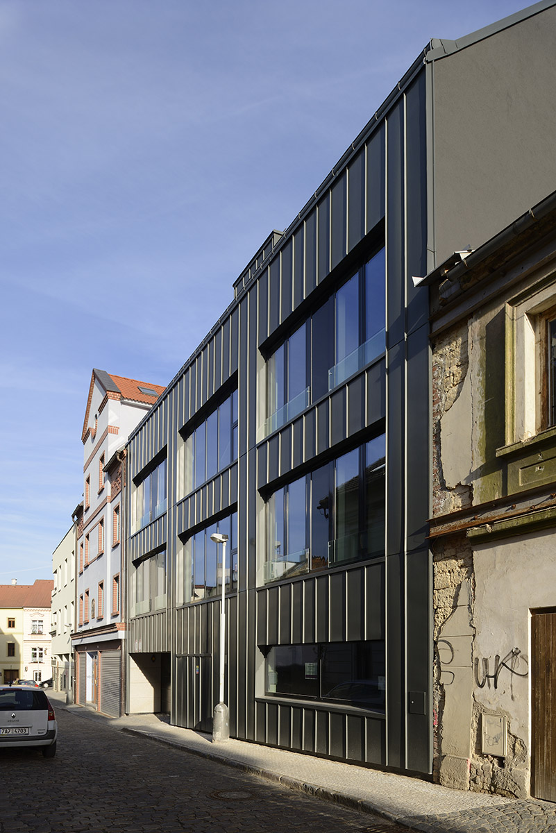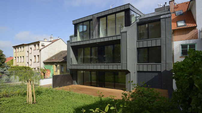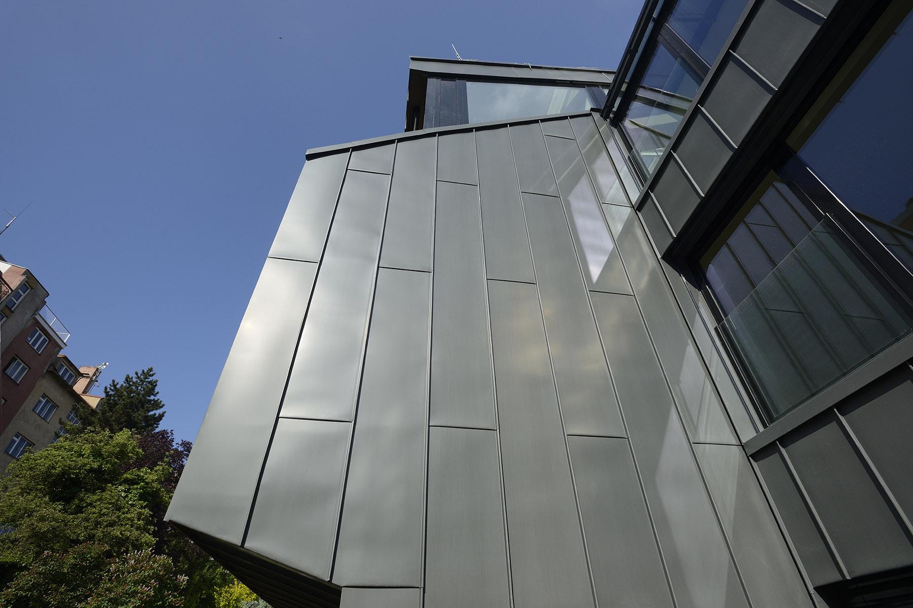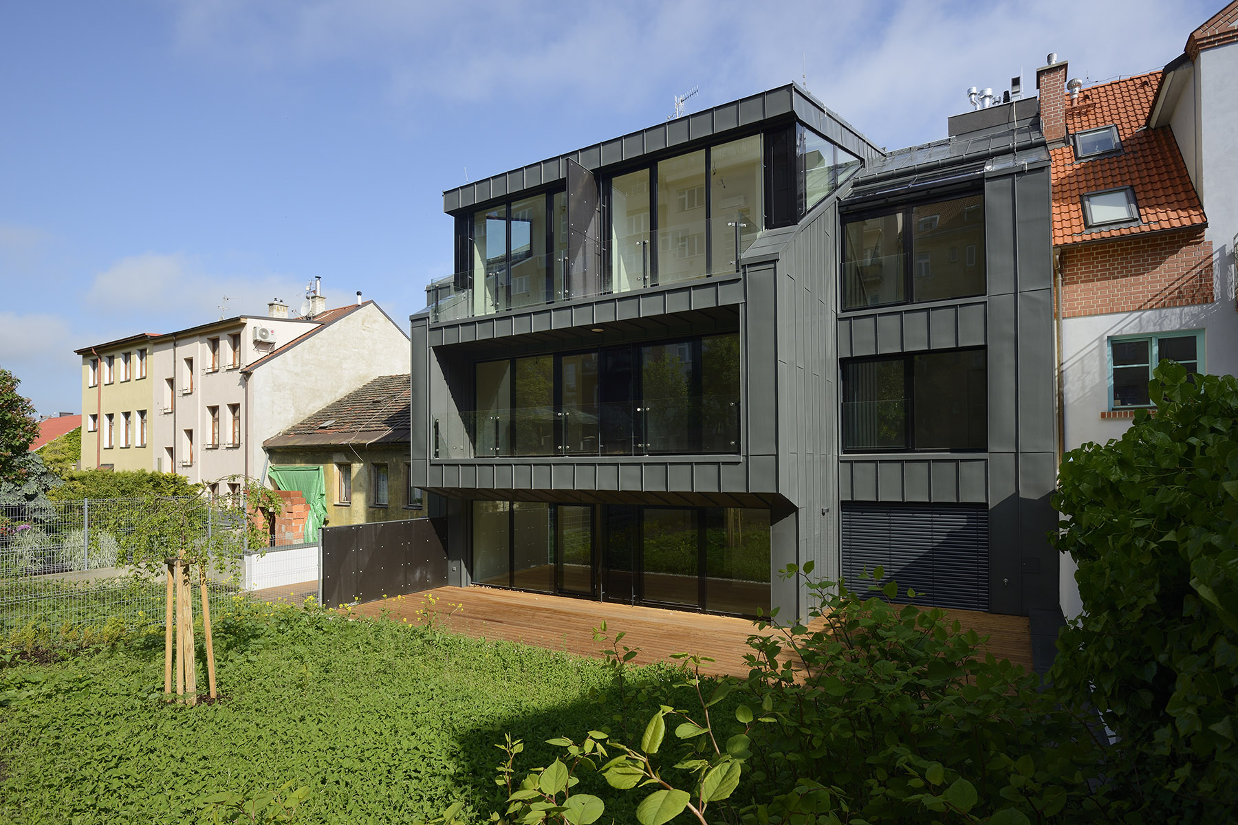 Hlavní hmota domu je jednoduchá, se sedlovou střechou reagující svým tvarem i výškou na své sousedy. Směrem na jih, do zahrady, je základní půdorysná stopa obdélníku rozšířena o příčné křídlo vsazené do středu jižní fasády. Ukončeno je pultovou střechou, která vychází z hřebene sedlové střechy. Celý dům je zabalen do jednotného plechového pláště z předoxidovaného titanzinkového plechu s pruhy stojatých drážek. Velká prosklení zaručují světlý interiér, který je v kontrastu s tmavým vzezřením domu. Komfortní bydlení v komorním prostředí rostlé zástavby širšího centra hlavního města.autorská zpráva