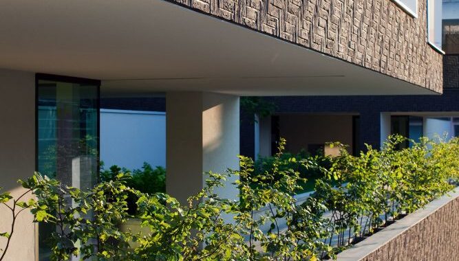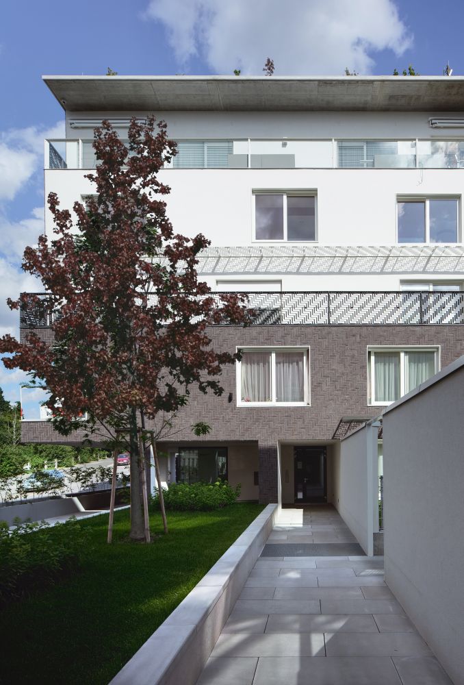 Uliční část přízemí má podobu krytých prostorů „loubí“ kolem vstupů. Hlavní vstup s bránou je umístěn společně s vjezdem do parkovacího suterénu ve snížené úrovni. Za vstupní bránou se nachází schodiště kryté vykonzolovaným objemem domu. Toto schodiště ústí na přízemní plató, oddělené od uličního prostoru živým plotem. Plató sestává z krytého loubí se vstupy do obou domů, malého vnitřního nádvoří s domovním stromem (dvojdub) a malé brány do soukromých zahrad. V zadní části přízemí 1. NP jsou byty s vlastními předzahrádkami. Na opačném konci, proti hlavní vstupní bráně, se nachází další vstup – bezbariérový, z úrovně ulice. Byty v posledním 5. NP mají výstup na zelenou střešní terasu.