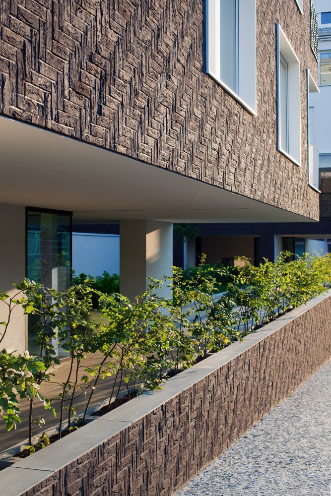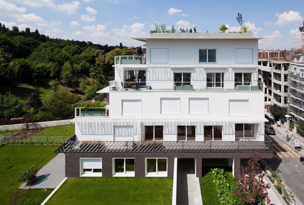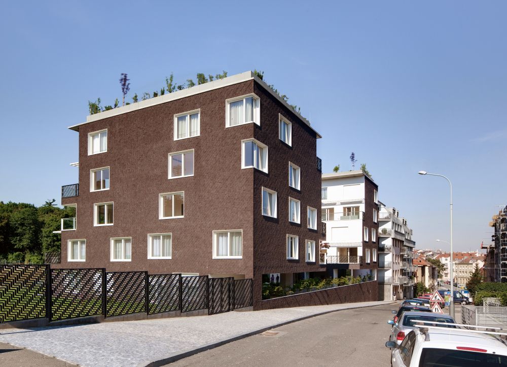 Novostavbu bytového domu tvoří dvě hmoty, které sedí na