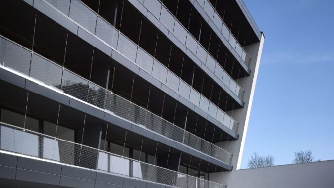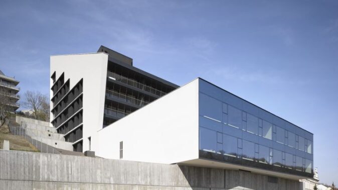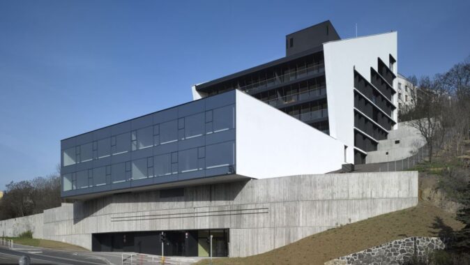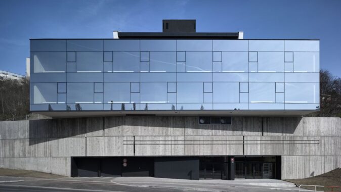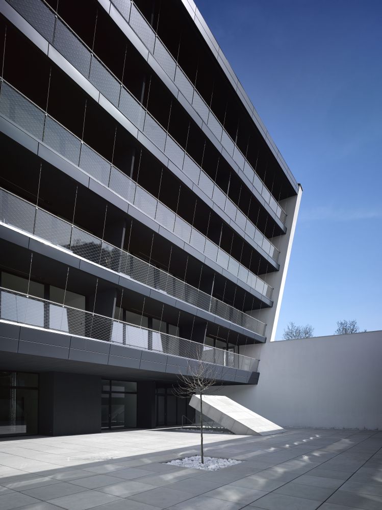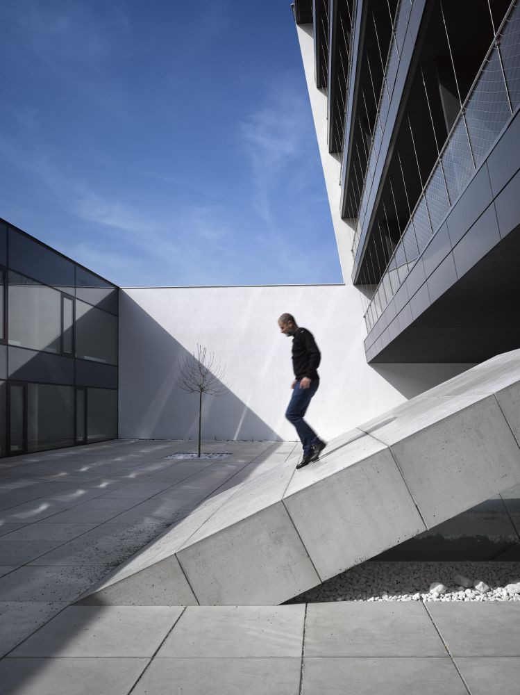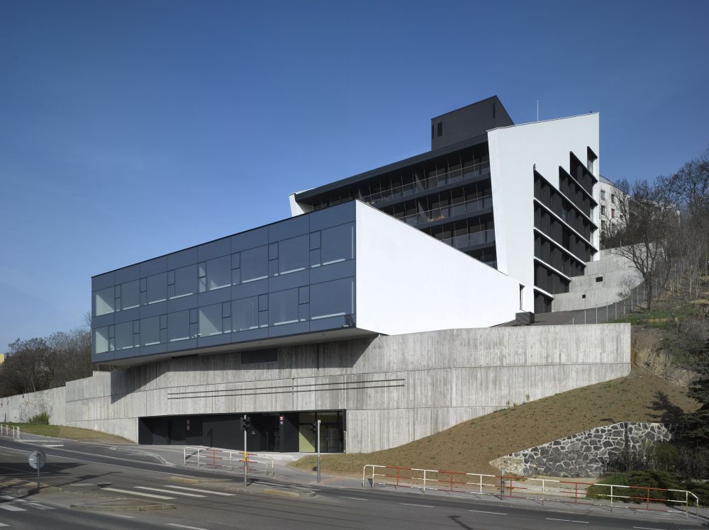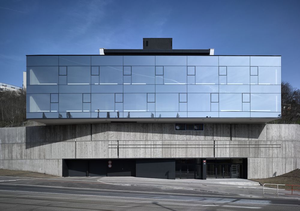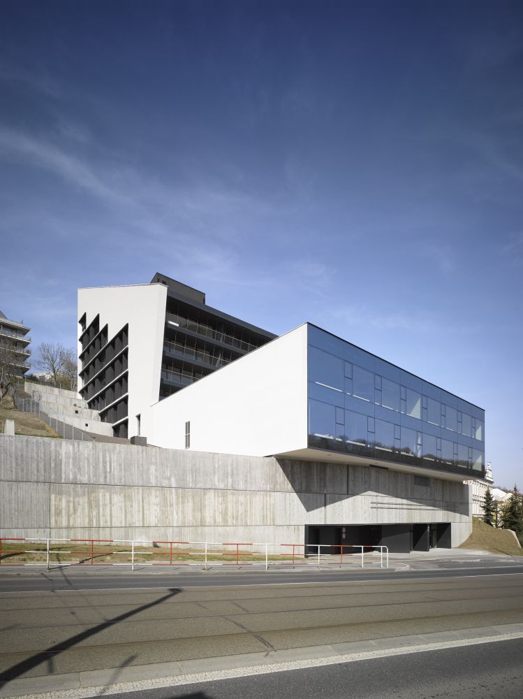 Na opěrnou zeď, jejíž objem je využit pro dvě, resp. tři podlaží podzemních garáží, je nasazena dvoupodlažní hmota administrativních prostor – dům do ulice, která společně se zdí představuje objem pětipodlažní stavby, obvyklé v Radlické ulici. Tato hmota tvoří zároveň akustickou clonu hluku, který i po přestavbě Radlické ulice bude představovat jistou zátěž.
