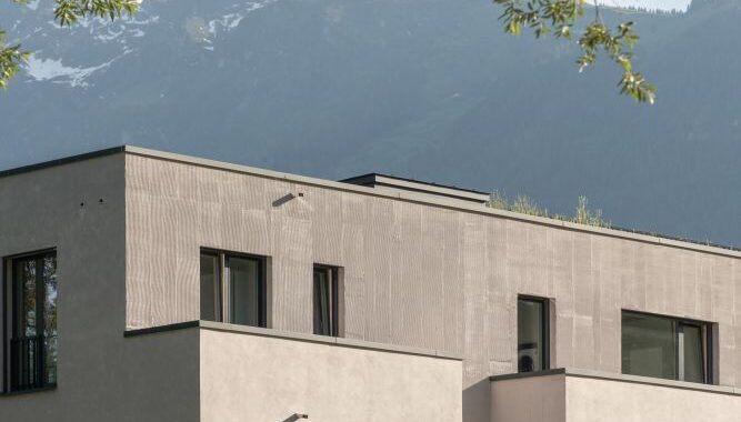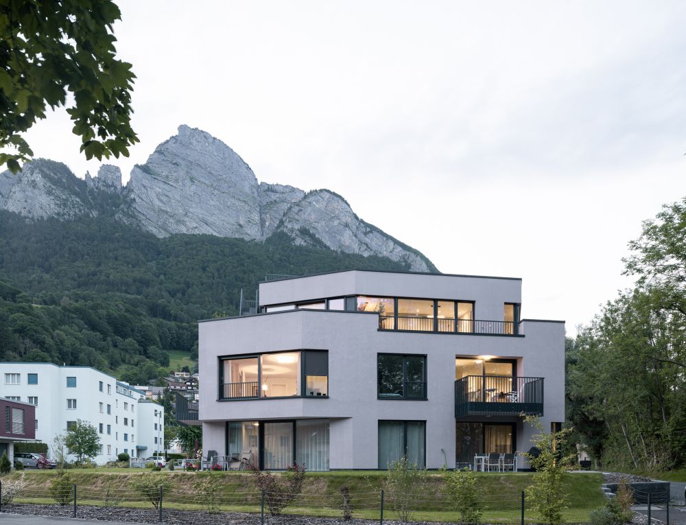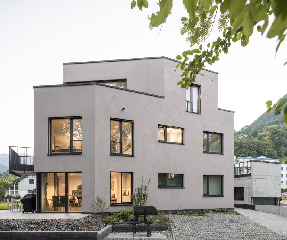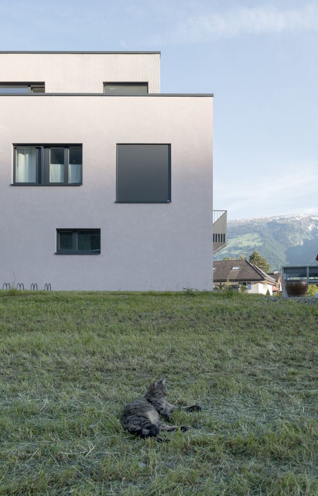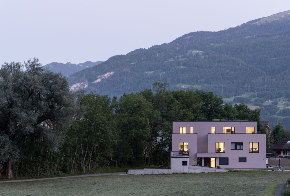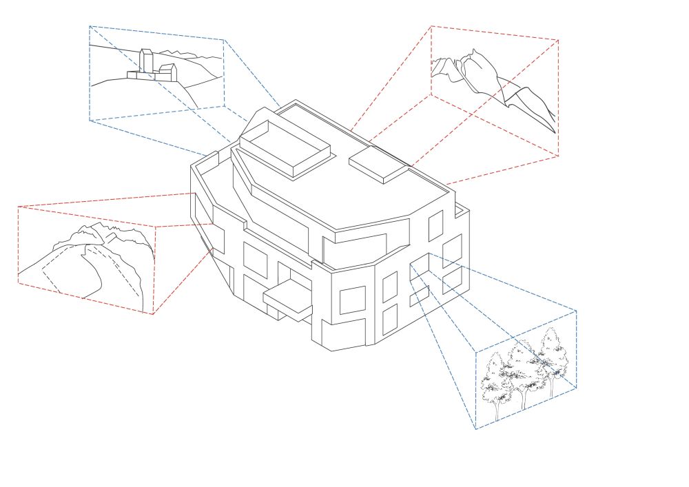 Okolní masivy hor se staly jednou z hlavních linek projektu. Vrcholky hor jsou důležitými body, na které jsme orientovali výhledy z pokojů a utvářely tak formu a půdorys domu. Narůžovělý kámen Verrucano-Schiefer, který se v okolí vyskytuje, se stal předobrazem pro materializaci fasády a vnitřních prostor. S ohledem na udržitelnost a ekologii byla navržena kompaktní obálka objektu. Dům působí jako vysekán z kamene, jednotlivé plochy fasád jsou definovány různými povrchy omítky a rozehrávají hru světla a stínu. Barva domu se v průběhu dne mění od světle šedivé při ranním rozbřesku až po růžovou při západu slunce.