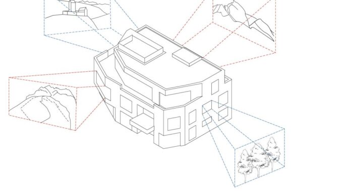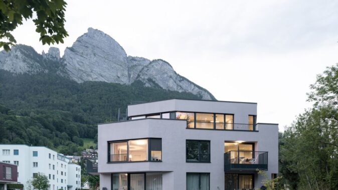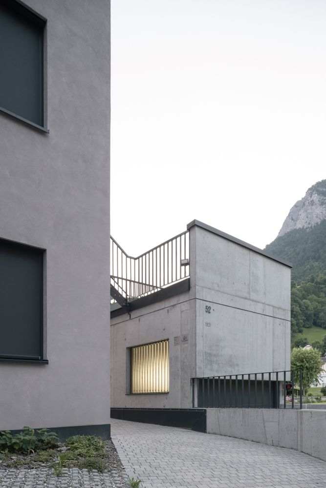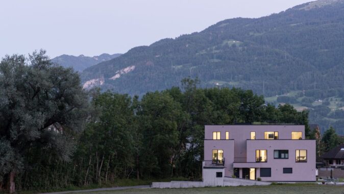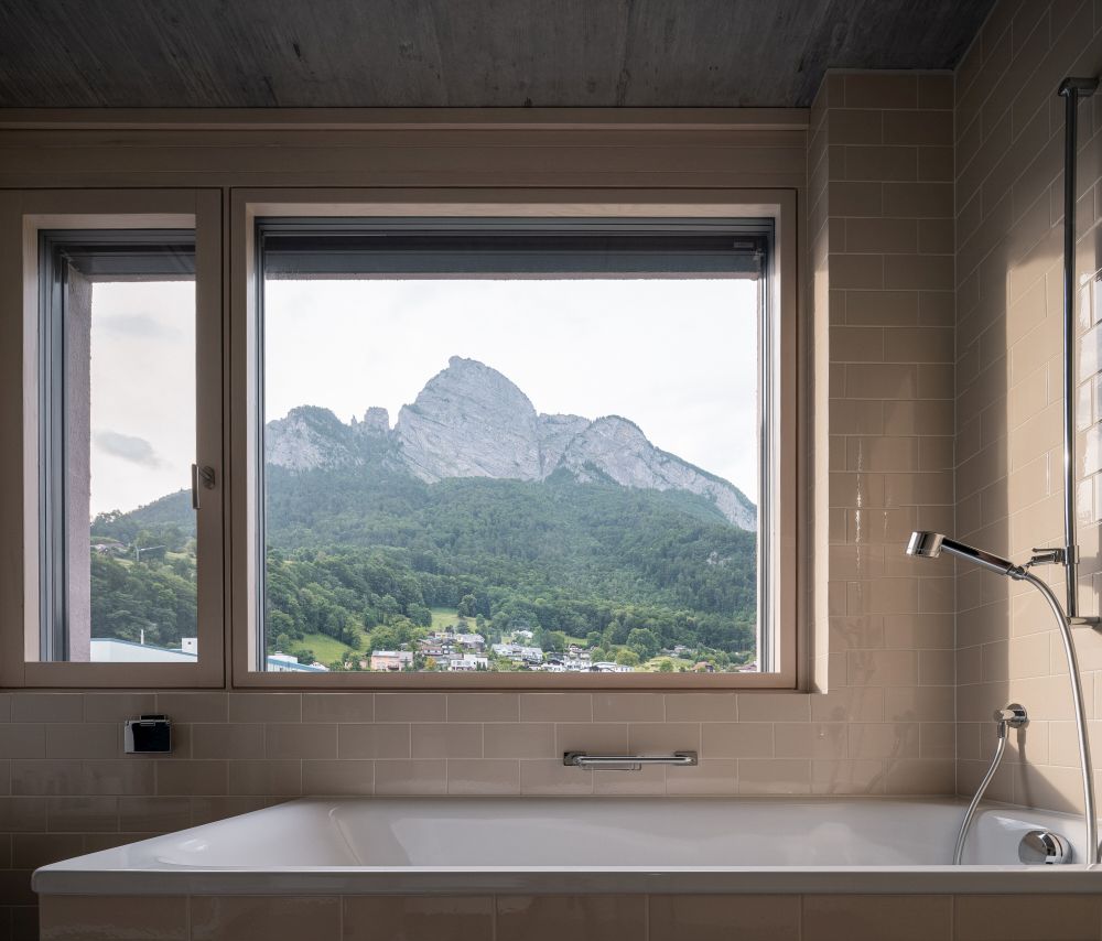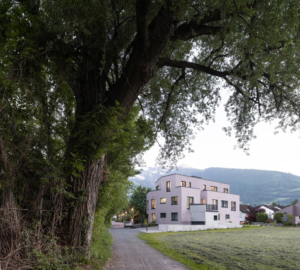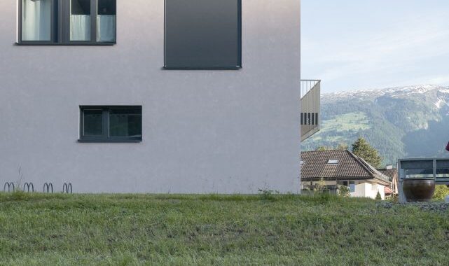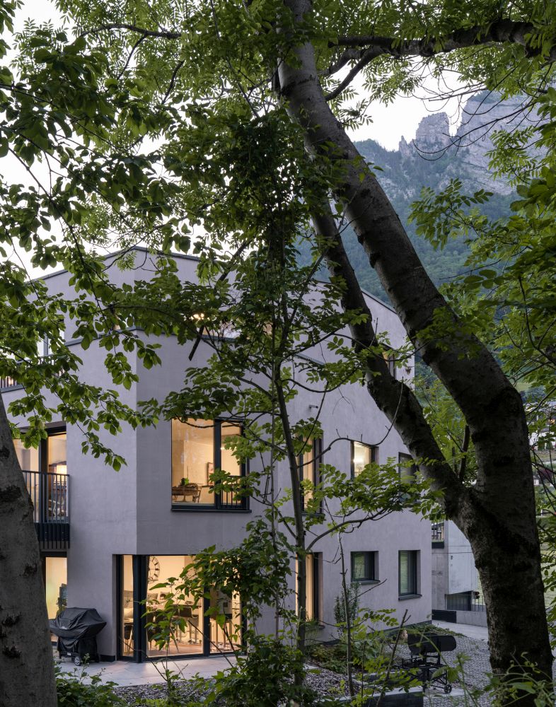 Okolní masivy hor se staly jednou z hlavních linek projektu. Vrcholky hor jsou důležitými body, na které jsme orientovali výhledy z pokojů a utvářely tak formu a půdorys domu. Narůžovělý kámen Verrucano-Schiefer, který se v okolí vyskytuje, se stal předobrazem pro materializaci fasády a vnitřních prostor. S ohledem na udržitelnost a ekologii byla navržena kompaktní obálka objektu. Dům působí jako vysekán z kamene, jednotlivé plochy fasád jsou definovány různými povrchy omítky a rozehrávají hru světla a stínu. Barva domu se v průběhu dne mění od světle šedivé při ranním rozbřesku až po růžovou při západu slunce.