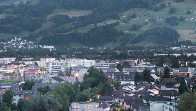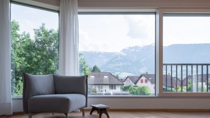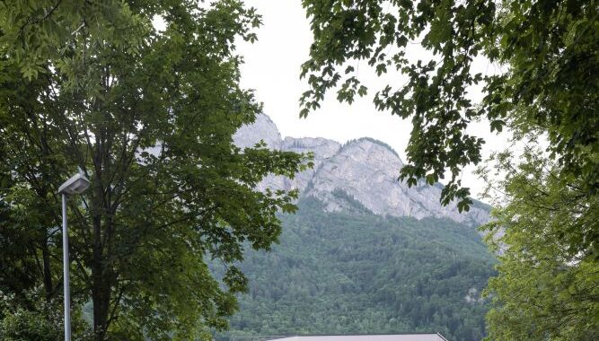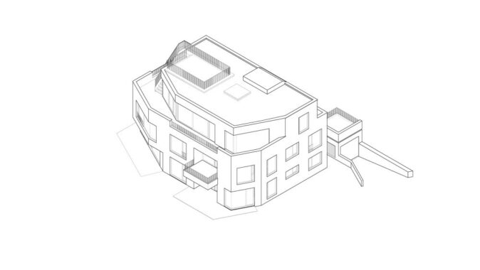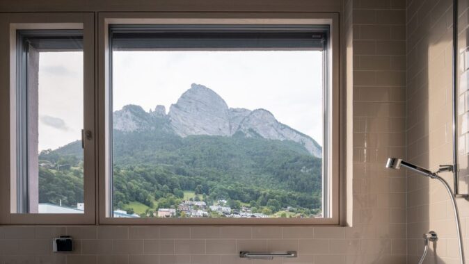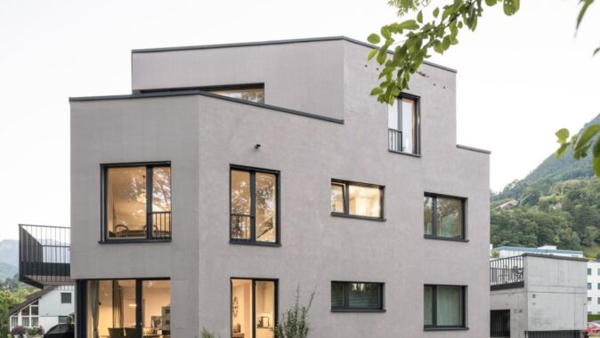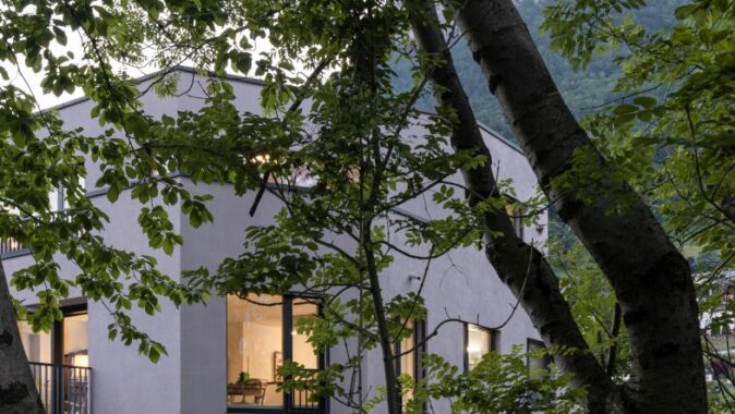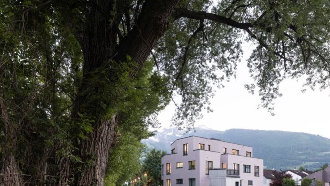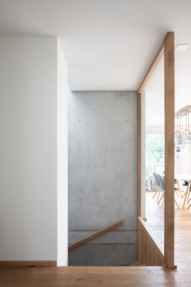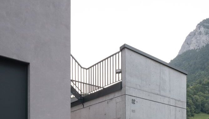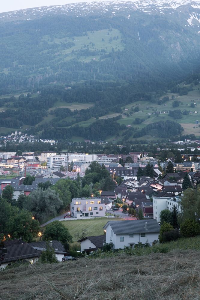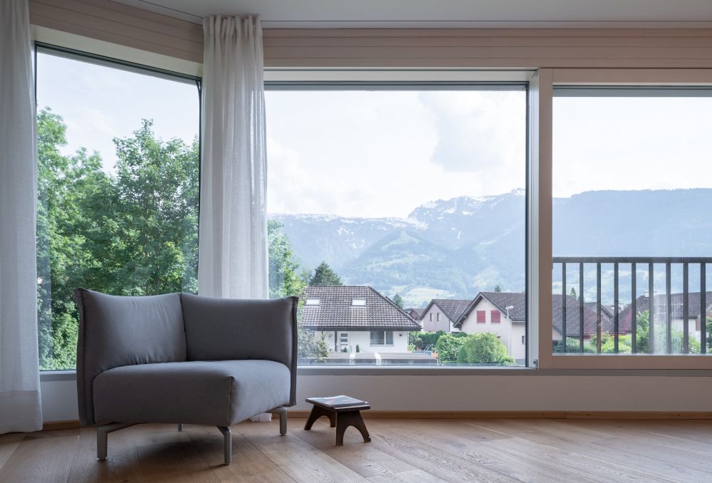 Okolní masivy hor se staly jednou z hlavních linek projektu. Vrcholky hor jsou důležitými body, na které jsme orientovali výhledy z pokojů a utvářely tak formu a půdorys domu. Narůžovělý kámen Verrucano-Schiefer, který se v okolí vyskytuje, se stal předobrazem pro materializaci fasády a vnitřních prostor. S ohledem na udržitelnost a ekologii byla navržena kompaktní obálka objektu. Dům působí jako vysekán z kamene, jednotlivé plochy fasád jsou definovány různými povrchy omítky a rozehrávají hru světla a stínu. Barva domu se v průběhu dne mění od světle šedivé při ranním rozbřesku až po růžovou při západu slunce.