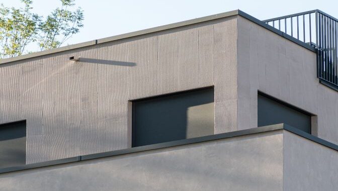 Obálka domu je zvenčí zaizolována, okna jsou dřevo-hliníková okna a je omítnuta těžkou cementovou omítkou s lehkou příměsí místního nadrceného kamene, který domu propůjčuje lehce nachový odstín. Atika, lodžie a místa, kde hmota domu ustupuje do pozadí, mají vertikálně proškrabovanou omítku.