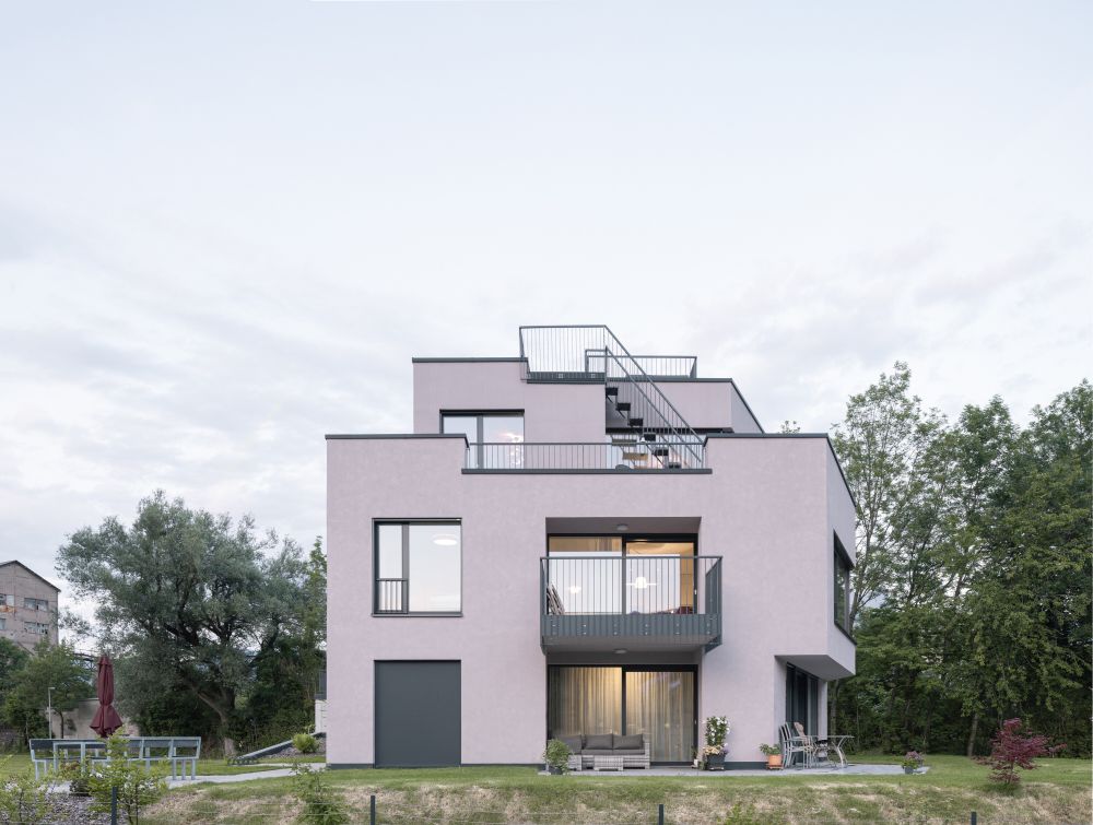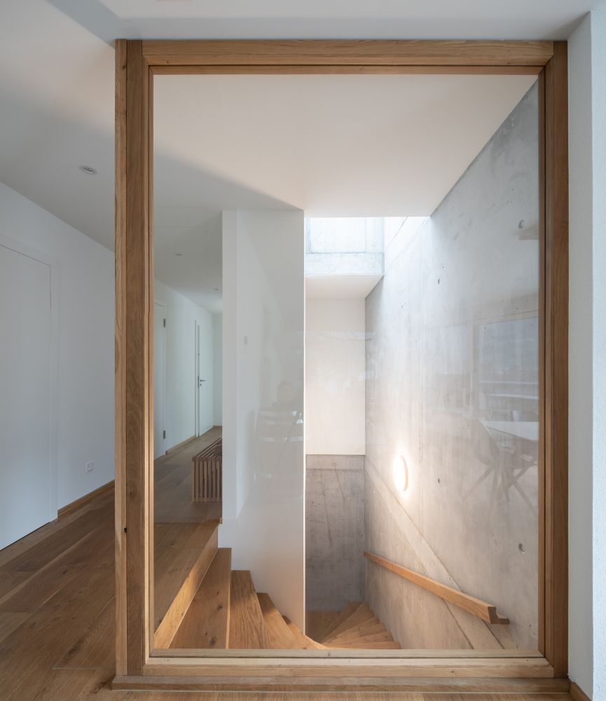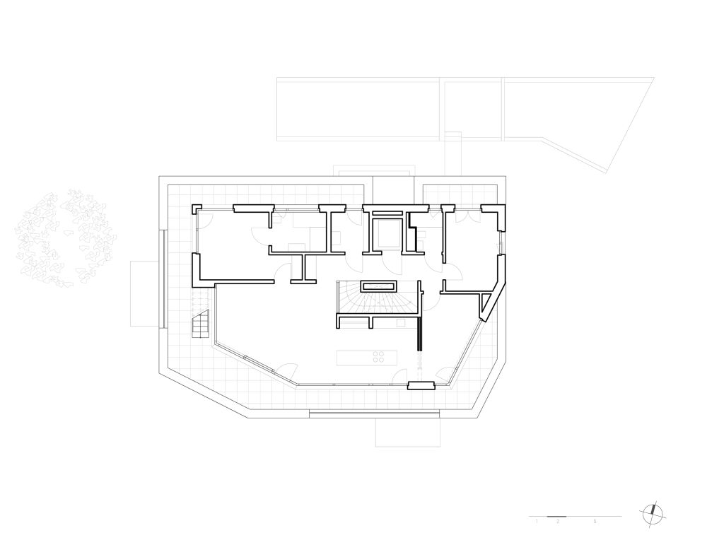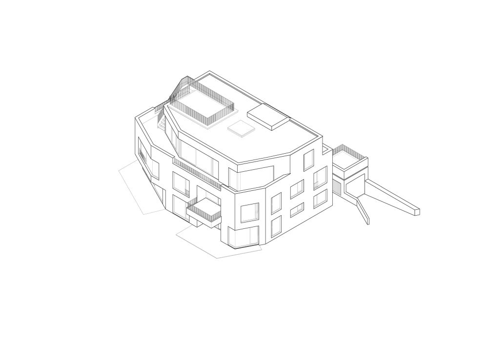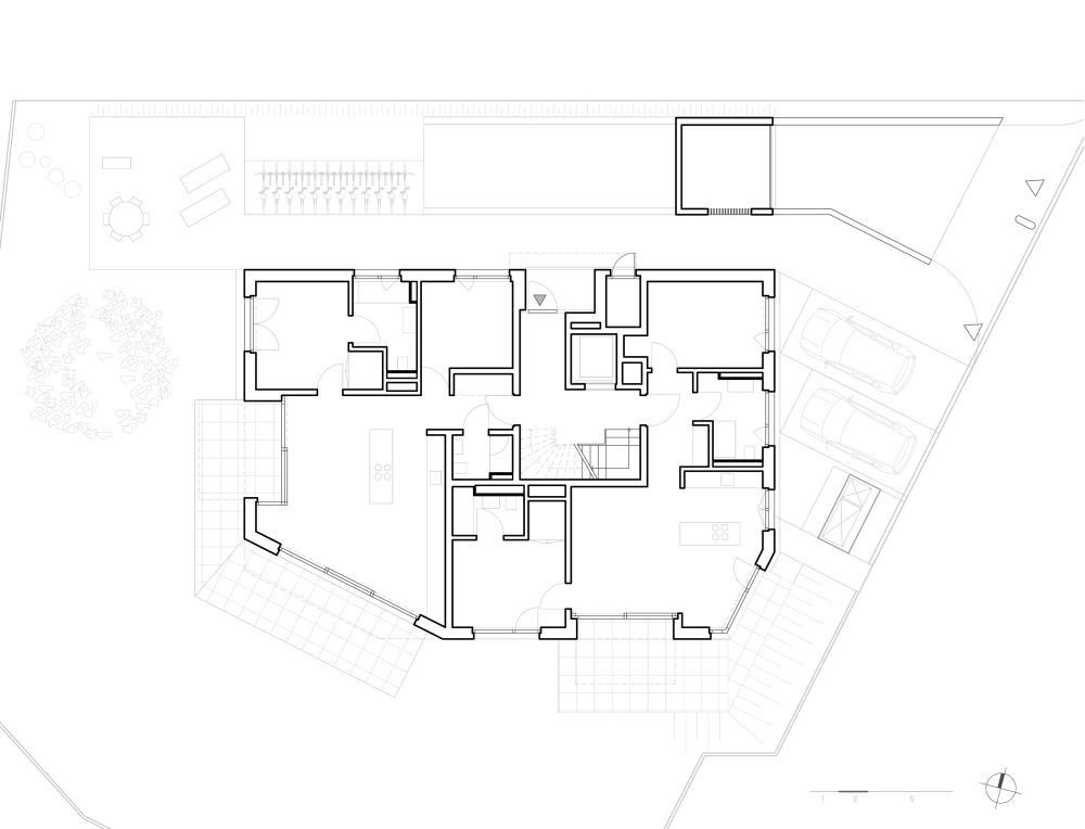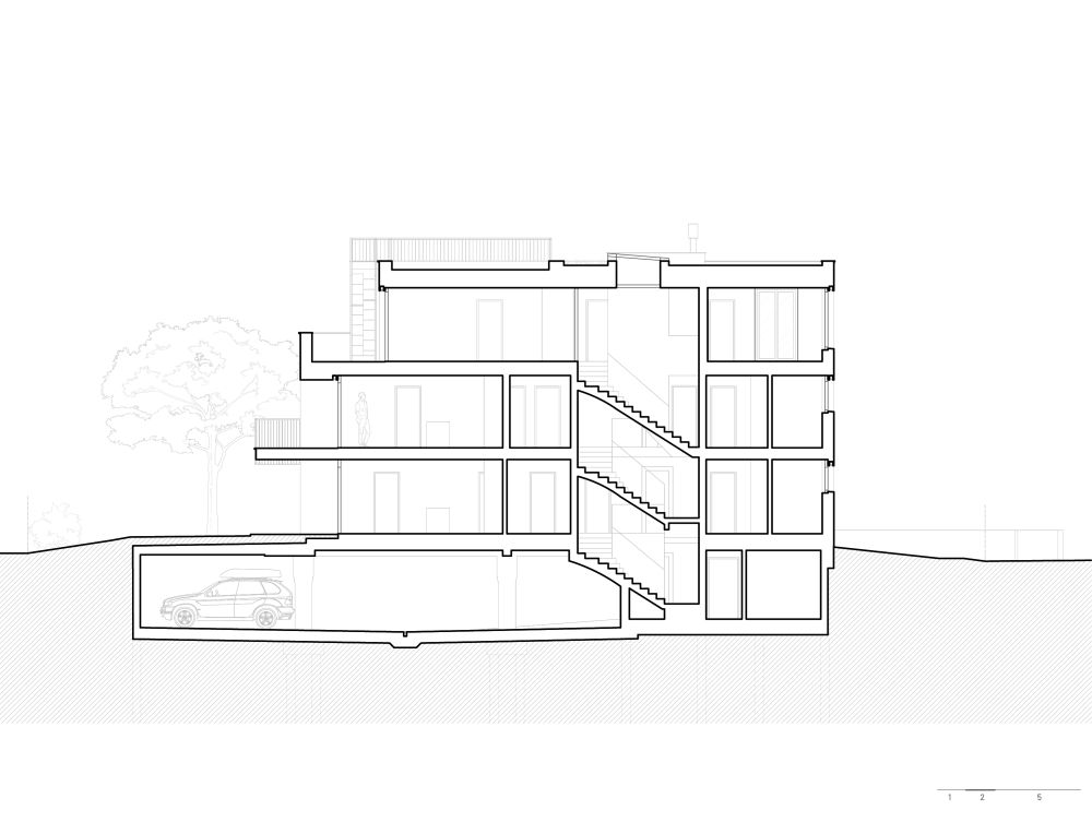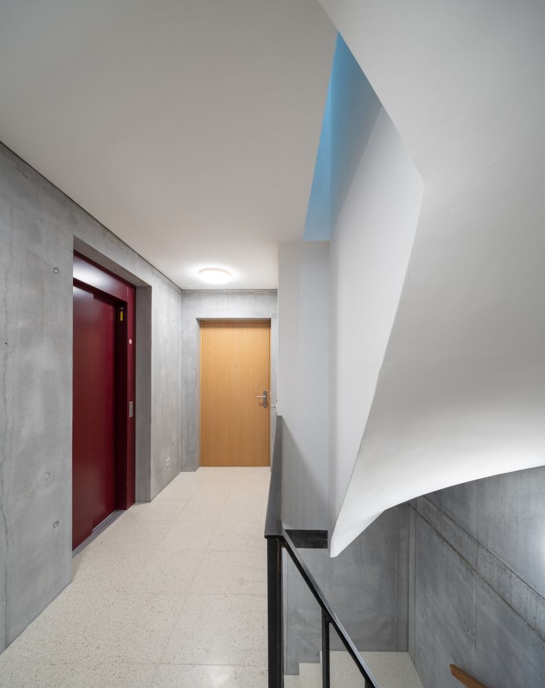 Jádrem a srdcem objektu je schodiště s výtahem, které jsme umístili uprostřed domu. Fasáda je tak k dispozici pro byty, které disponují velkorysými půdorysy s několikastrannou orientací místností, dostatkem denního světla a výhledy, a to i z často přehlížených místností domu jako jsou koupelny a kuchyně. Kompozičně jsou byty navrženy na stejném principu – bez slepých chodeb a s přímým propojením na obývací prostory. Díky tomu je vždy zaručen průhled ven na okolní krajinu. V bytech není dodrženo rozdělení na pobytovou a spací část, pokoje jsou přístupné i z obývacího pokoje čímž je dosaženo zefektivnění plochy bytu.