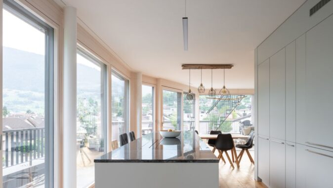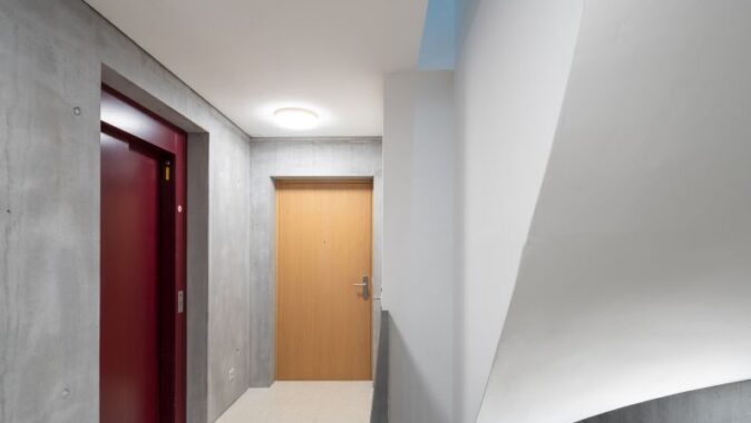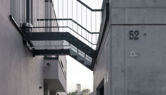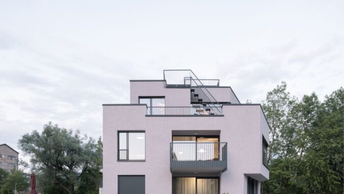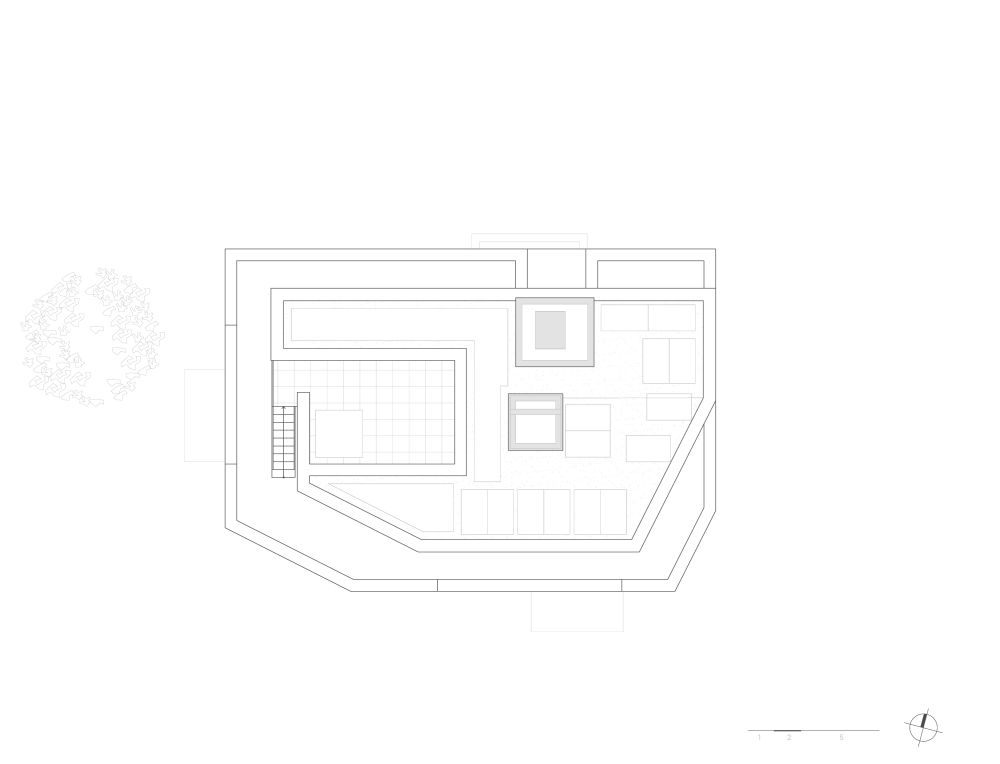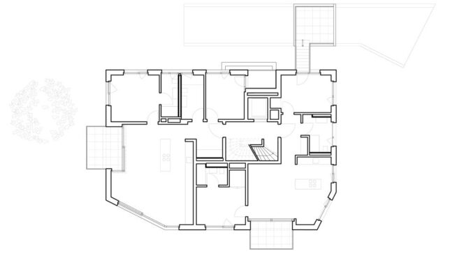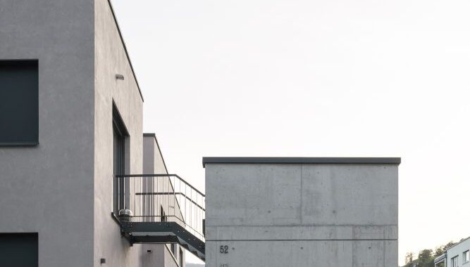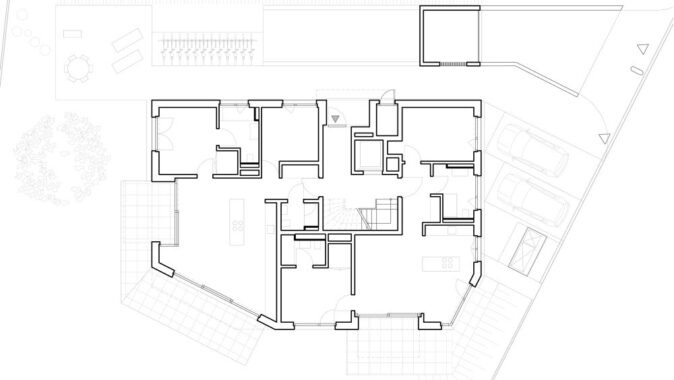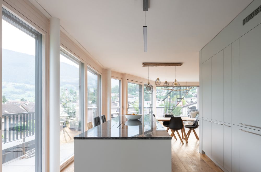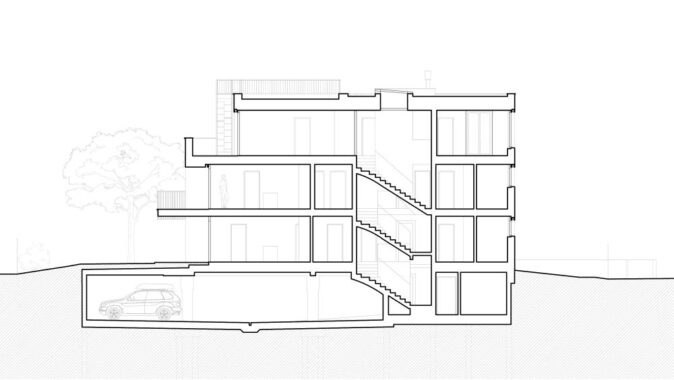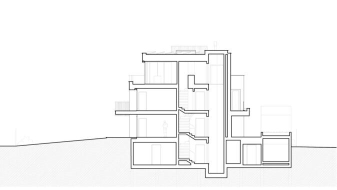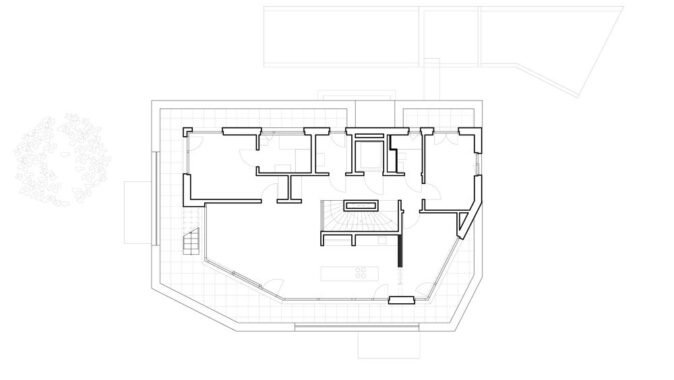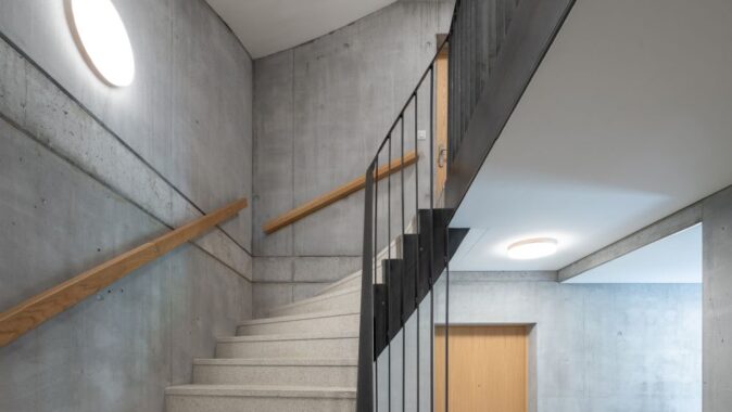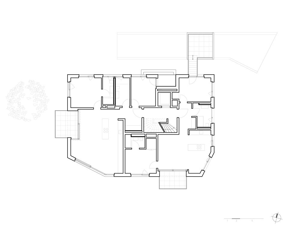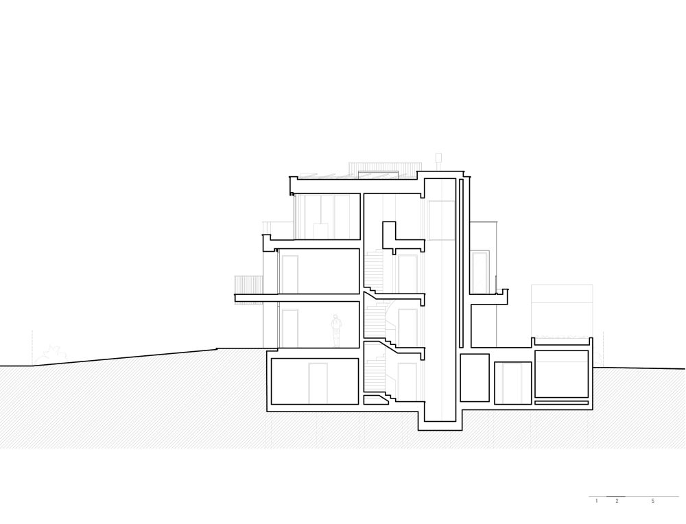 Jádrem a srdcem objektu je schodiště s výtahem, které jsme umístili uprostřed domu. Fasáda je tak k dispozici pro byty, které disponují velkorysými půdorysy s několikastrannou orientací místností, dostatkem denního světla a výhledy, a to i z často přehlížených místností domu jako jsou koupelny a kuchyně. Kompozičně jsou byty navrženy na stejném principu – bez slepých chodeb a s přímým propojením na obývací prostory. Díky tomu je vždy zaručen průhled ven na okolní krajinu. V bytech není dodrženo rozdělení na pobytovou a spací část, pokoje jsou přístupné i z obývacího pokoje čímž je dosaženo zefektivnění plochy bytu.