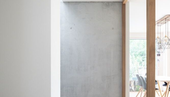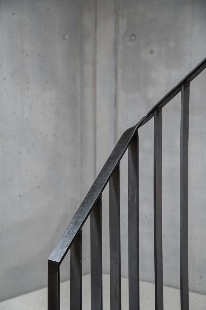 Společné prostory jsou z trvalých materiálů – černá ocel, pohledový beton a teraco na podlaze. Pohledový beton ve schodišti a koupelnách podtrhuje určitou surovost domu. Materializace objektu odkazuje jak na dlouholeté podnikání s kovy otce investora, tak na kontext a historii místa s okolními železnými doly.