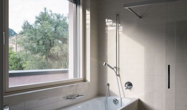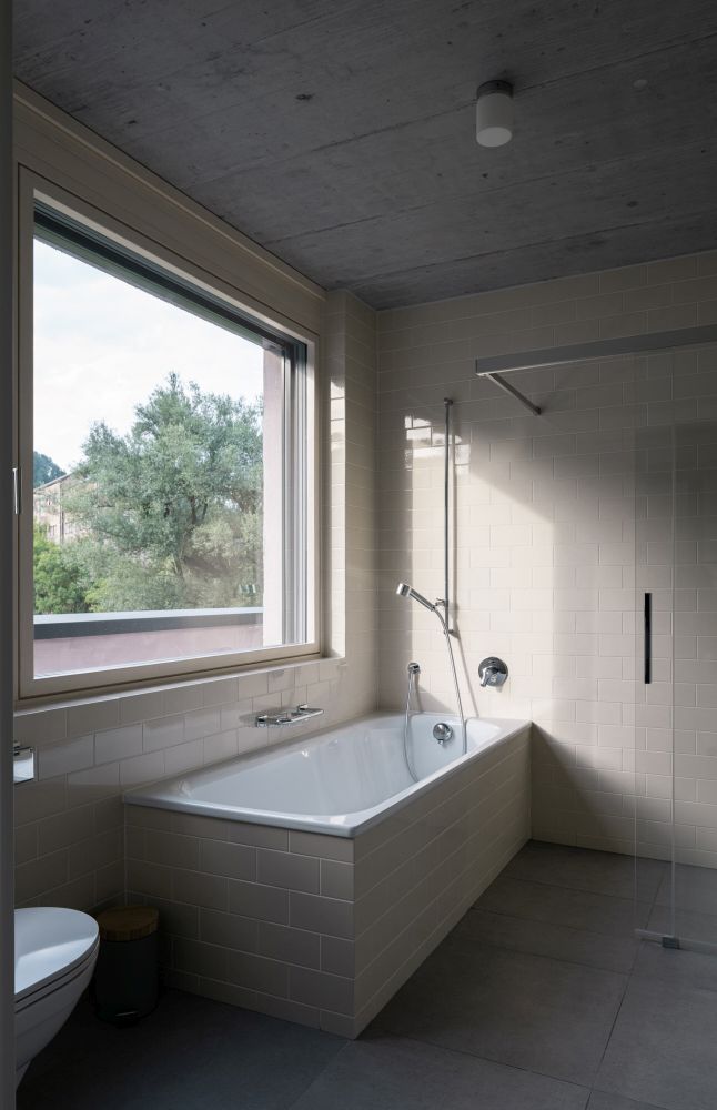 Materiály: pohledový beton – schodišťový prostor, koupelny; těžká proškrabovaná cementová omítka s příměsí místního nadrceného kamene Verrucano-Schiefer s povrchovou lazurou – venkovní fasáda; černá ocel – zábradlí dle autorského návrhu; teraco – podlahy ve společných prostorách; lakovaná MDF – vestavěný nábytek dle autorského návrhu; vícevrstvá dřevěná podlaha – obytné prostory.