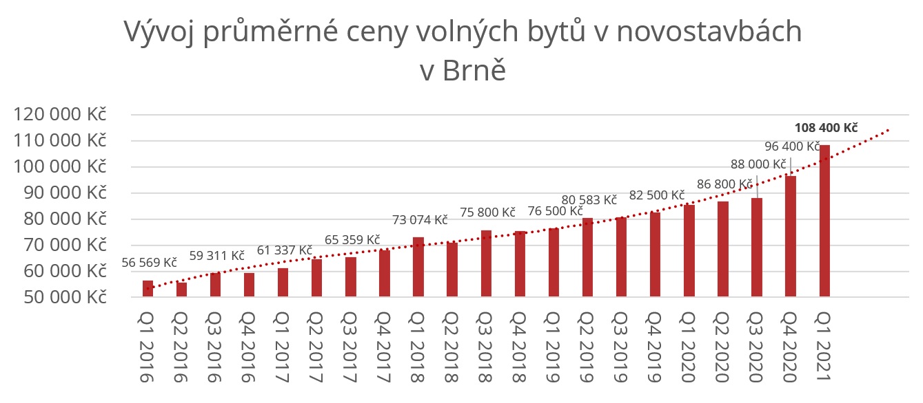 V brněnské nabídce je aktuálně 483 volných bytů v novostavbách. Během prvního čtvrtletí se do ní dostalo celkem 324 bytů, nicméně tři čtvrtiny z nich byly v jednom jediném rezidenčním projektu. Přestože byty neustále zdražují a metr čtvereční nyní vyjde v průměru na téměř 109 tisíc korun, kolem 40 procent těchto nově nabízených bytů je již rezervovaných. „Kdyby se do prodeje tento významný projekt nedostal, v brněnské nabídce by bylo jen 244 volných bytů, což je extrémně nízké číslo. Město by proto mělo co nejdříve představit plán, jak se mají rezidenční projekty rozvíjet, jinak se tento raketový růst cen nezastaví,“ varuje Alexej Veselý, výkonný ředitel společnosti Trikaya. Ceny žene vzhůru především zkostnatělé územní plánování spolu s pomalými a náročnými povolovacími procesy nových staveb, ale také zdražování pozemků a stavebních prací včetně materiálů.