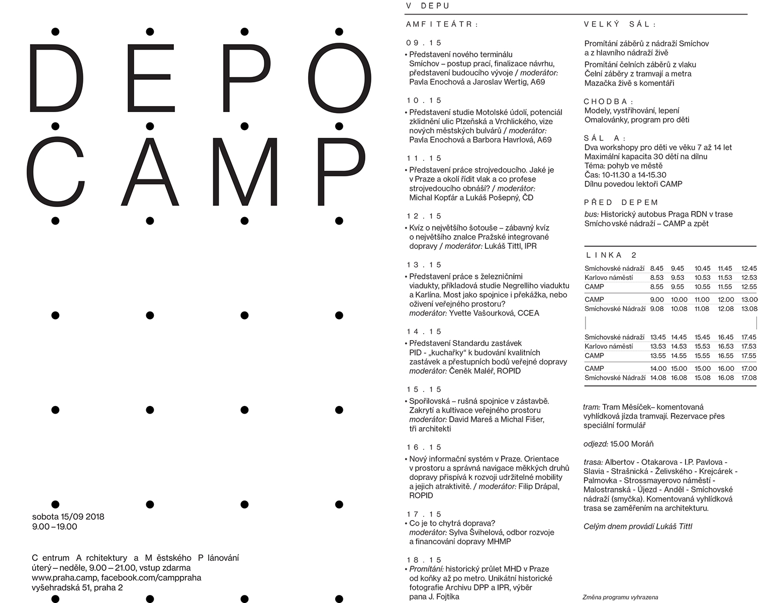 • Velký sál CAMPu bude od 20. září patřit zásadní výstavě Pře(d)stav si Prahu. Návštěvníkům bude hravě vysvětlovat Strategický plán hl. m. Prahy.