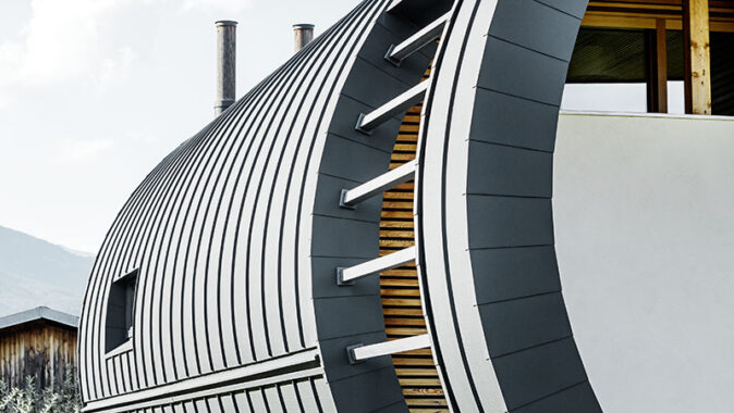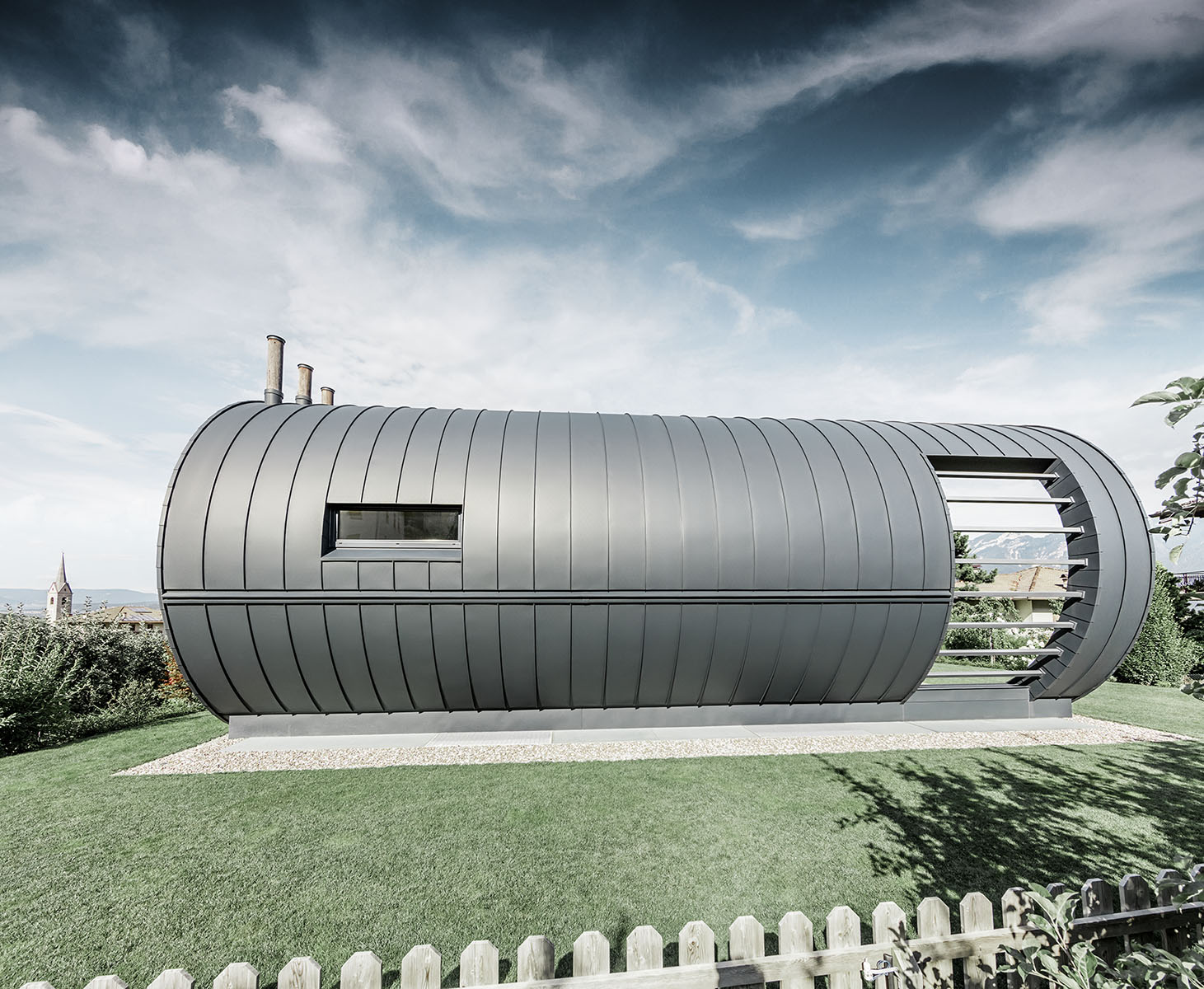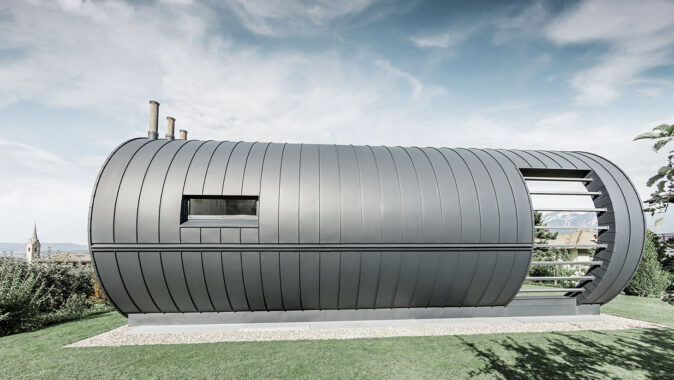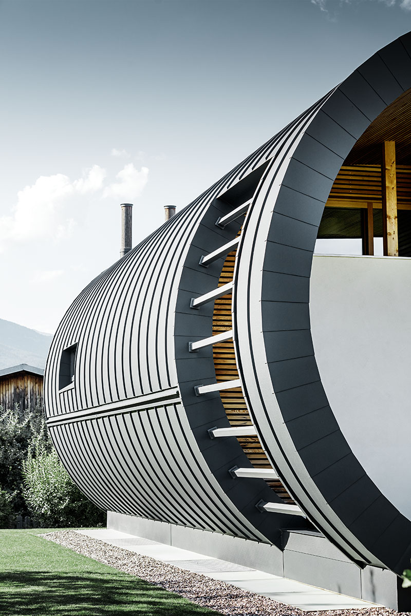 výstavbu oživuje neobyčejný projekt oválné budovy, kterou chrání hliníková