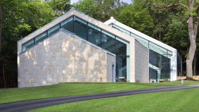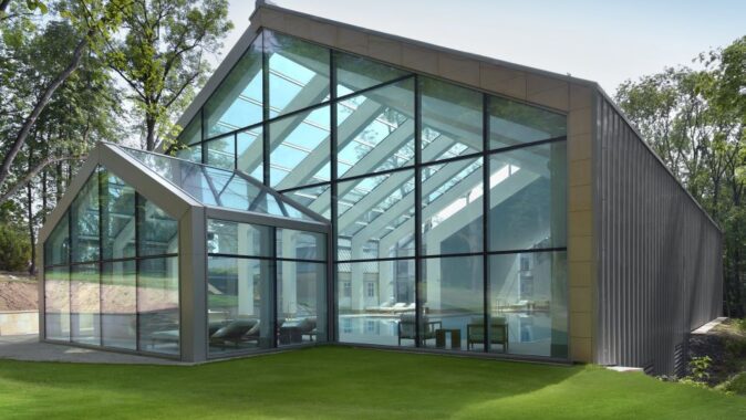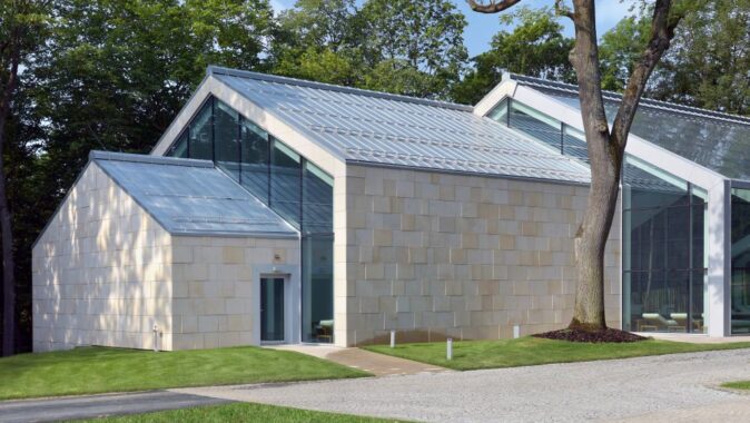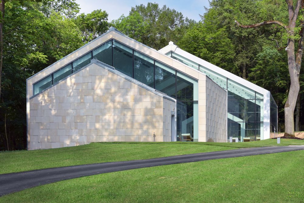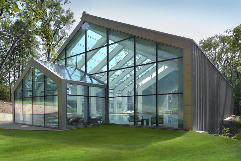 s kamenným obkladem, prosklené stěny jsou z hliníkových profilů.