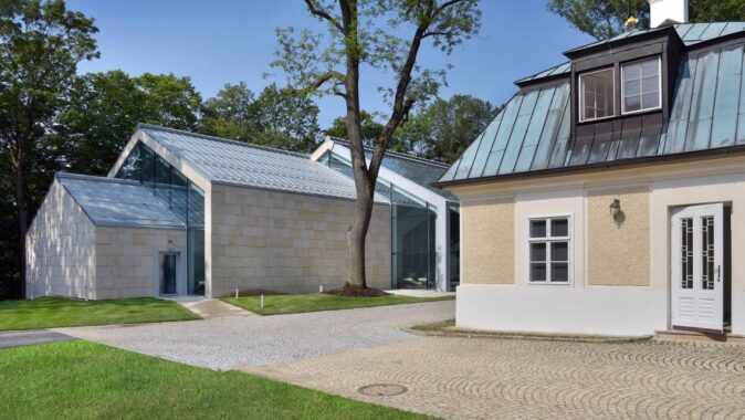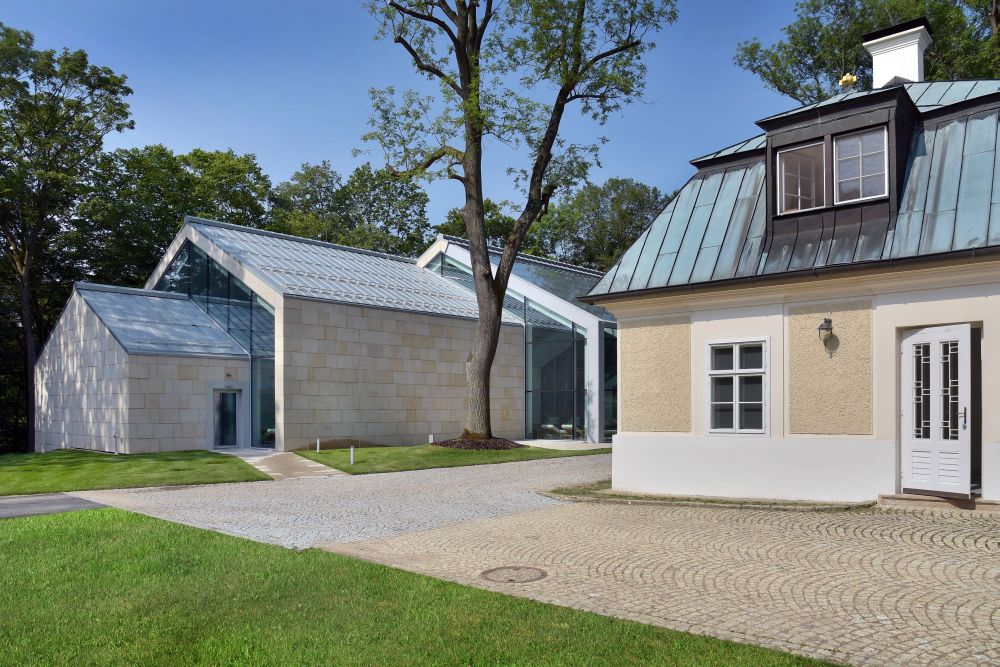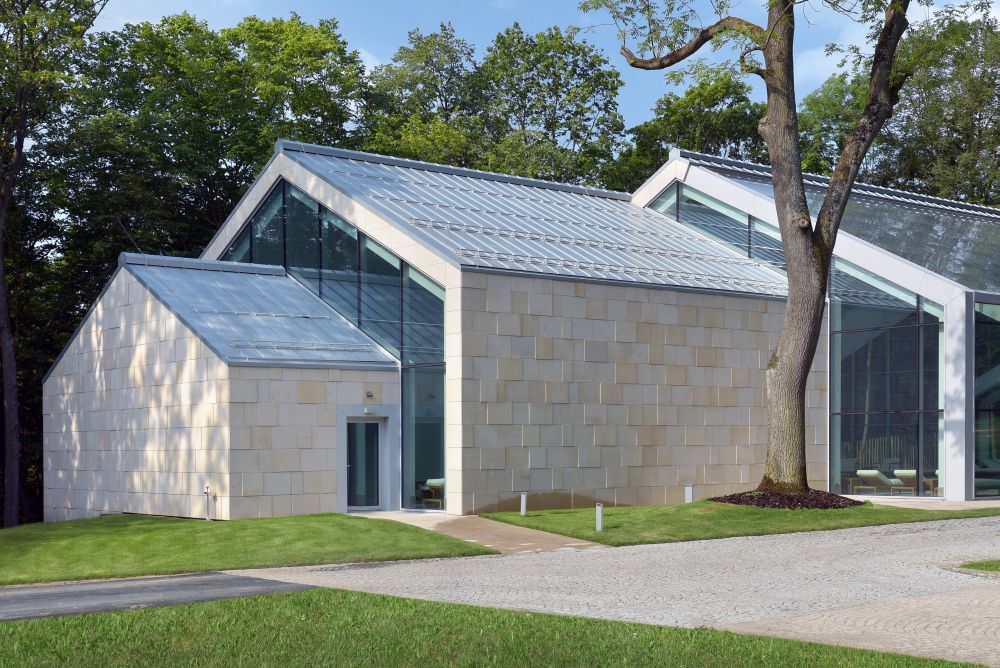 předzvětralého falcovaného titanzinkového plechu. Obvodový plášť je provětrávaný