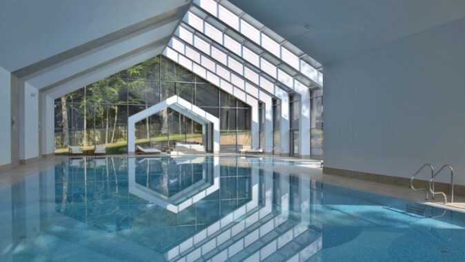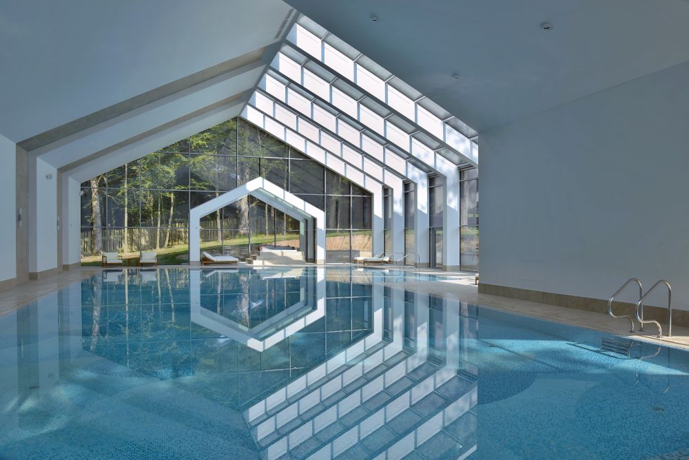 Vnitřní prostory bazénu mají keramický obklad, zázemí má hladké sádrové omítky. Schodiště z přízemí do 1. PP je skleněné, schodišťové stupně jsou podsvícené, stejně tak madlo na zábradlí. Objekt je vybaven technologickým vybavením pro bazén a technologii pro sauny.