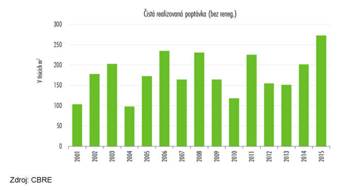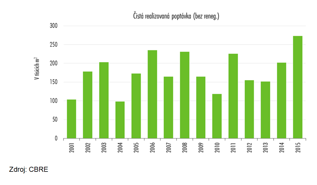 Výhodné podmínky pro nájemce se pozitivně odráží i na poptávce celého trhu. Nejvyšší poptávka po kancelářských prostorech byla zaznamenána v posledním čtvrtletí loňského roku. Veškeré nájemní transakce, tzv. „take-up“, uzavřené v uvedených třech měsících, představují celkovou nájemní plochu 105 900 m2, čímž došlo k dosažení rekordní úrovně 272 900 m2 za celý rok 2015 (viz graf).