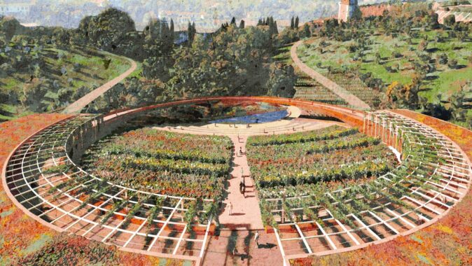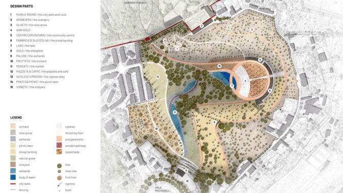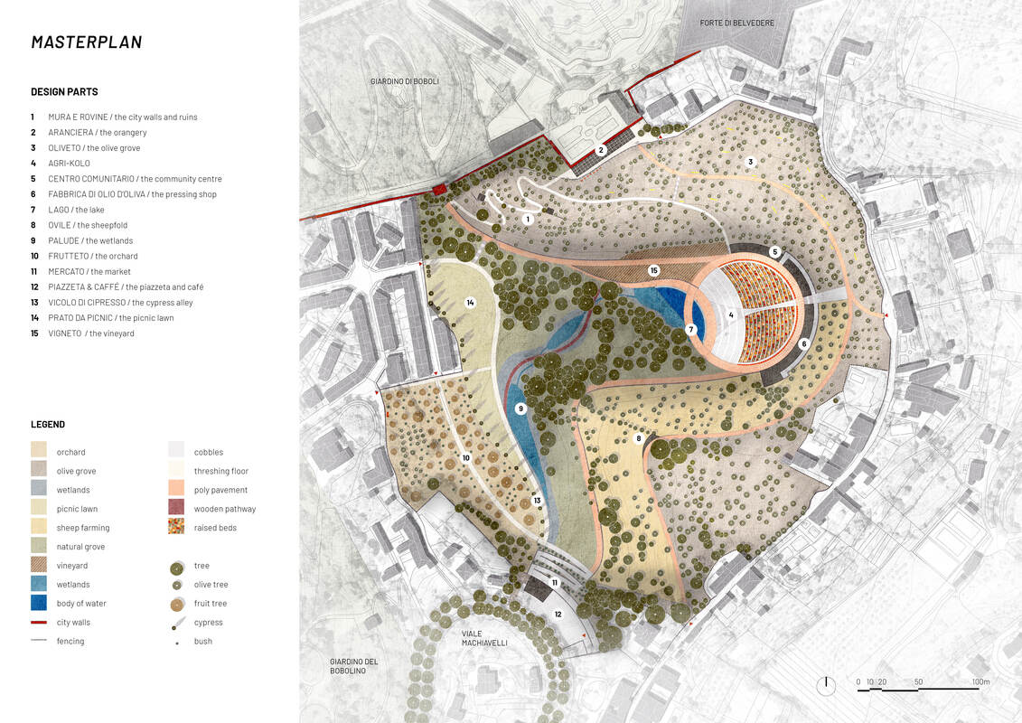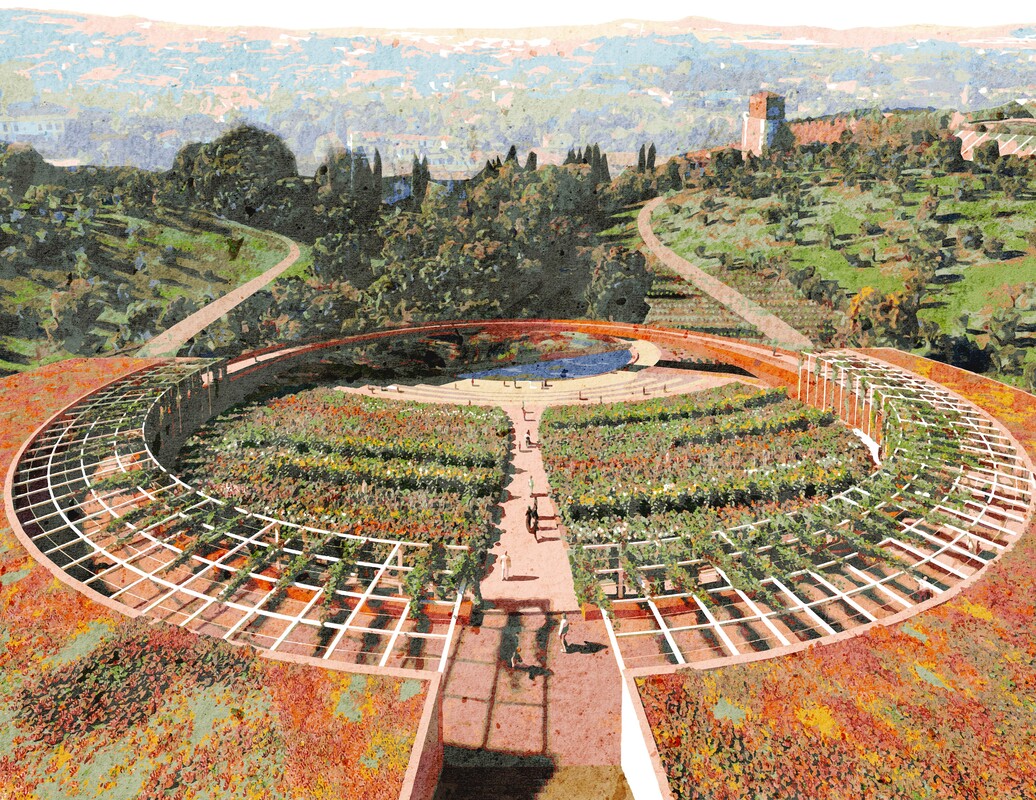 Autorka nově zpracovává nyní nepřístupnou městskou divočinu poblíž centra Florencie, aby umožnila její funkční zapojení do organismu města, života jeho obyvatel, kteří by zde našli tolik potřebné osvěžení v prostředí jakési nové rajské zahrady, vrstevnaté až fantaskní, která v harmonickém souladu s morfologií terénu přechází od olivových hájů a ovocných sadů na svazích do vinic a luk spásaných ovcemi ke středovému komunitnímu centru exaltovaného kruhového tvaru (nazývaného Agri-kolo) s mostem levitujícím nad vodní plochou lesnatého mokřadu a v těžišti vyplněným záhony květin a bylin. Porota oceňuje promyšlené zpracování v souvislostech a také profesionální prezentaci návrhu, která kvalitativně patří k nejlepším v soutěži.