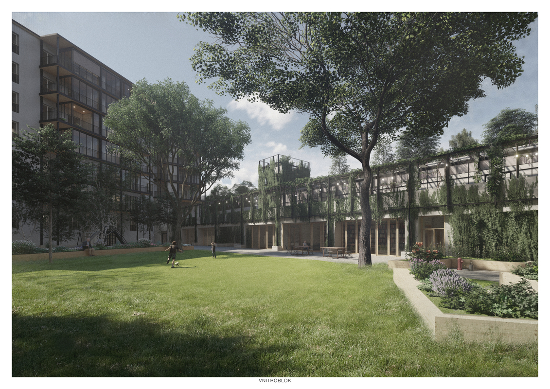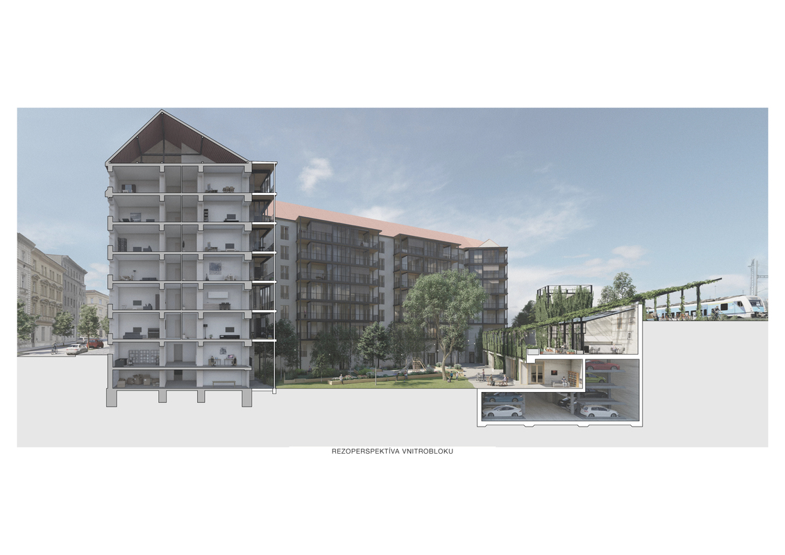 Téma řešení vnitrobloků zástavby je neustále aktuální. V současné době velké množství vnitrobloků supluje funkci parkování vzhledem k jeho nedostatku ve velkých městech, především pak Praze. Uvedený návrh jde v řešení dopravy v klidu ještě dále tím, že se snaží odlehčit parkování i v přiléhajících ulicích. Parkování umisťuje do podzemní části objektu umístěného do otevřené části vnitrobloku. Nadzemní část objektu tvoří multifunkční prostory pro veřejné využívání. Nadzemní část objektu zároveň částečně splňuje i funkci akustické bariéry od hluku přiléhající železniční tratě.