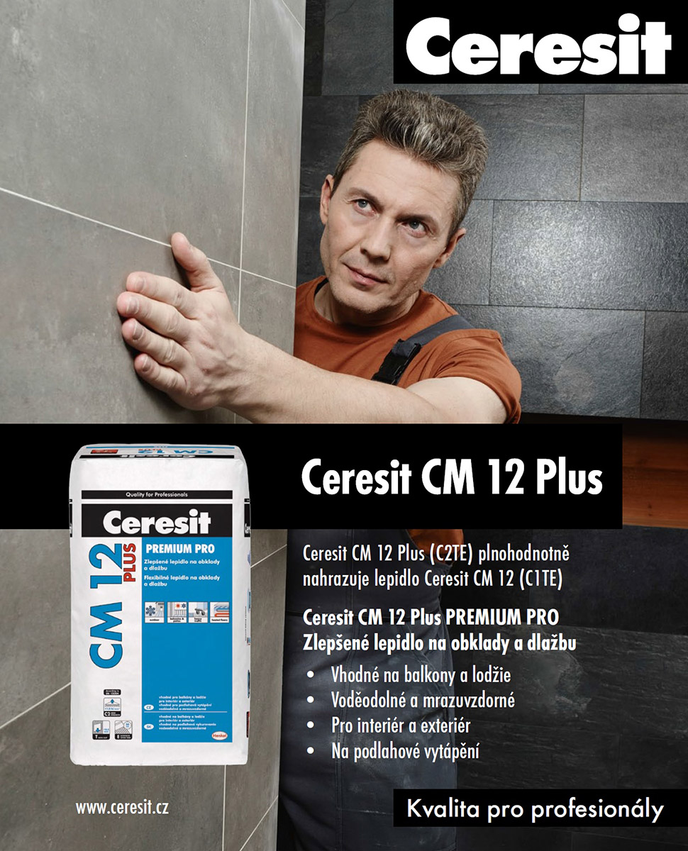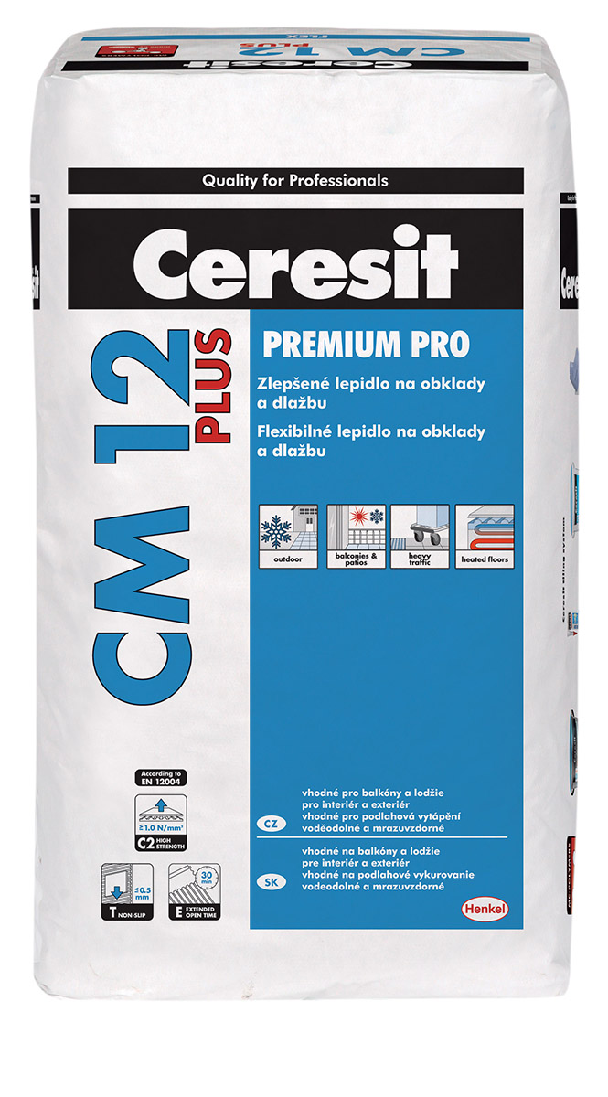 Zlepšené lepidlo se zvýšenou přilnavostí Ceresit CM 12 PLUS Premium Pro (C2TE) je určené k lepení nenasákavé (gresové) dlažby, obkladů a dlažeb, desek z betonu a přírodního kamene (nenáchylného na probarvení). Podkladem může být beton, cementové potěry, cementové i vápenocementové omítky. Vlastnosti lepidla umožňují použití na sádrovláknité desky a sádrokarton (tl. ≥ 12,5 mm) a hydroizolace a těsnicí malty Ceresit. Vysoká přídržnost lepidla umožňuje použití i na kritických podkladech, jako jsou stávající keramické obklady a dlažby, pevné malířské nátěry, sádrové podklady, anhydrit a pórobeton.