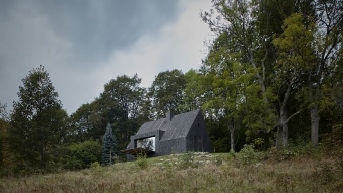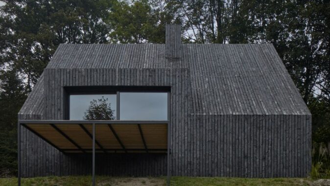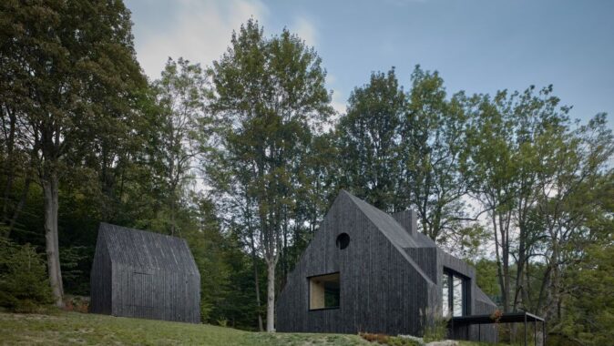 Nad údolím Horské Kamenice šumí opadaný buky, se kterými si vítr pohrává jako s nějakým pravěkým hudebním nástrojem. Z černýho domu na úpatí kopce stoupá bílej kouř, kterej dává tušit, že chata není prázdná. Původní tvář nedostavěné chaty z osmdesátých let se změnila k nepoznání. Šedivý brizolit nahradilo černé dřevěné obložení, které si majitelé sami opalovali. Obklad přechází i na střešní plochy a hlavní dům i s malou chatičkou tak vypadá hodně abstraktně. Termíny jako střecha, zeď, či komín splývají v jediném celku. Stojí tu dům s okny a terasou. Některá z oken ořezává fasádní obložení do kulatého tvaru. Dům vypadá jako přerostlá ptačí budka.