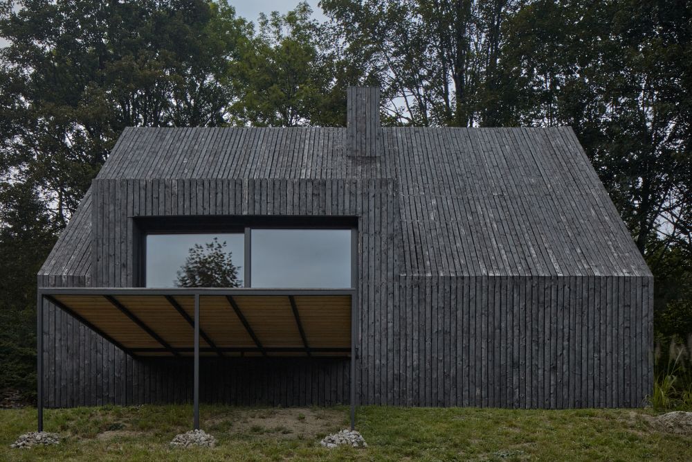 Nad údolím Horské Kamenice šumí opadaný buky, se kterými si vítr pohrává jako s nějakým pravěkým hudebním nástrojem. Z černýho domu na úpatí kopce stoupá bílej kouř, kterej dává tušit, že chata není prázdná. Původní tvář nedostavěné chaty z osmdesátých let se změnila k nepoznání. Šedivý brizolit nahradilo černé dřevěné obložení, které si majitelé sami opalovali. Obklad přechází i na střešní plochy a hlavní dům i s malou chatičkou tak vypadá hodně abstraktně. Termíny jako střecha, zeď, či komín splývají v jediném celku. Stojí tu dům s okny a terasou. Některá z oken ořezává fasádní obložení do kulatého tvaru. Dům vypadá jako přerostlá ptačí budka.