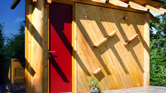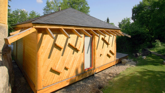 stojí mimo hlavní skelet domu je hygienické zázemí, které bylo řešeno jako