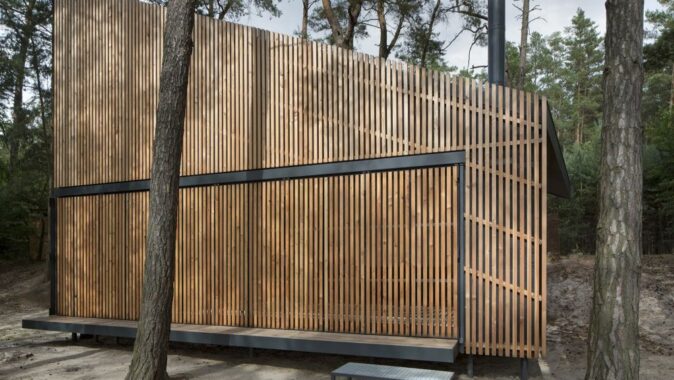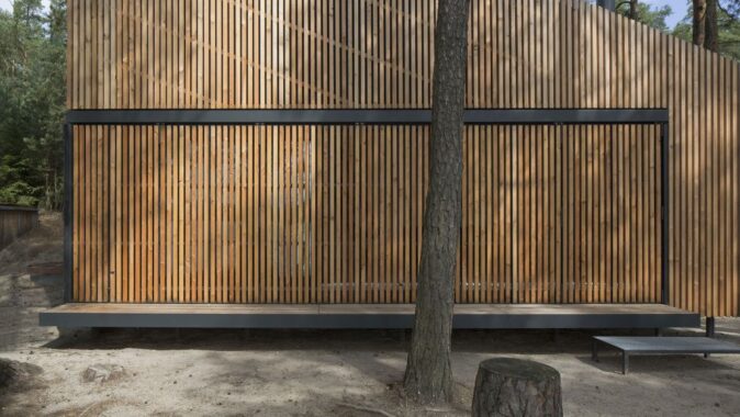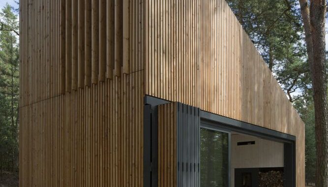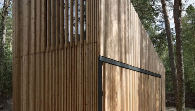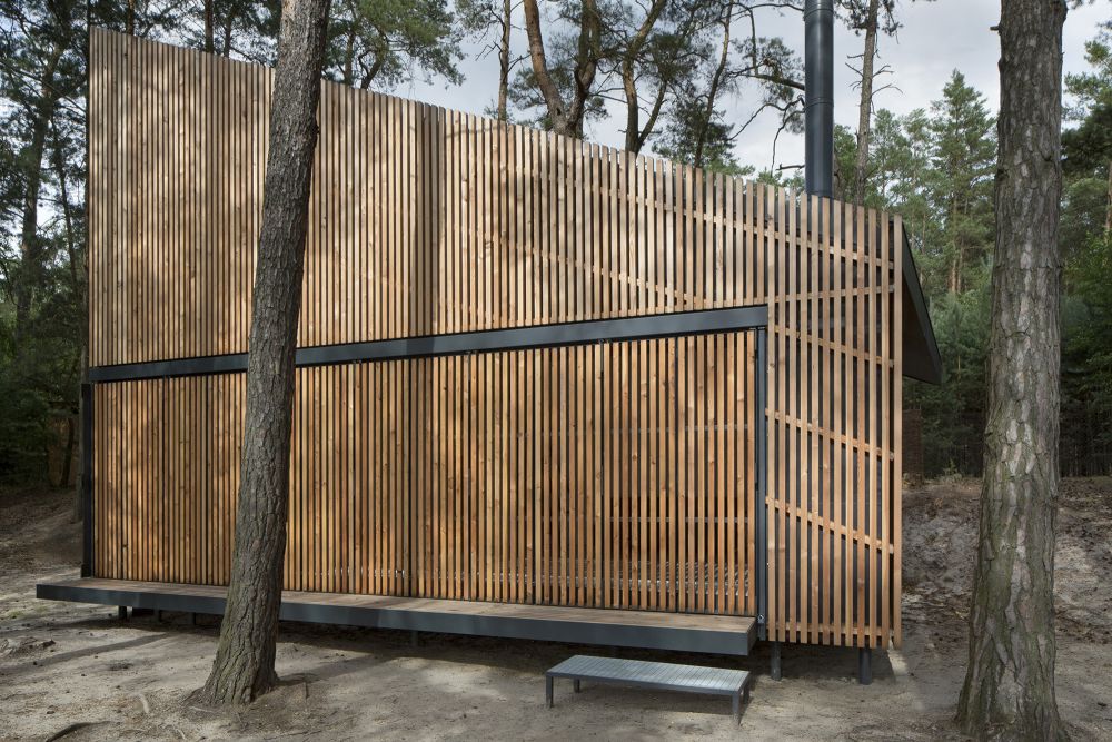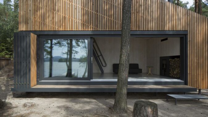 Náhrada starší chaty na břehu jezera v borovicovém lese
