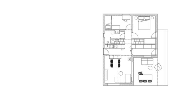 řešením a využívá chytré truhlářské vestavby doplněné o pár kusů