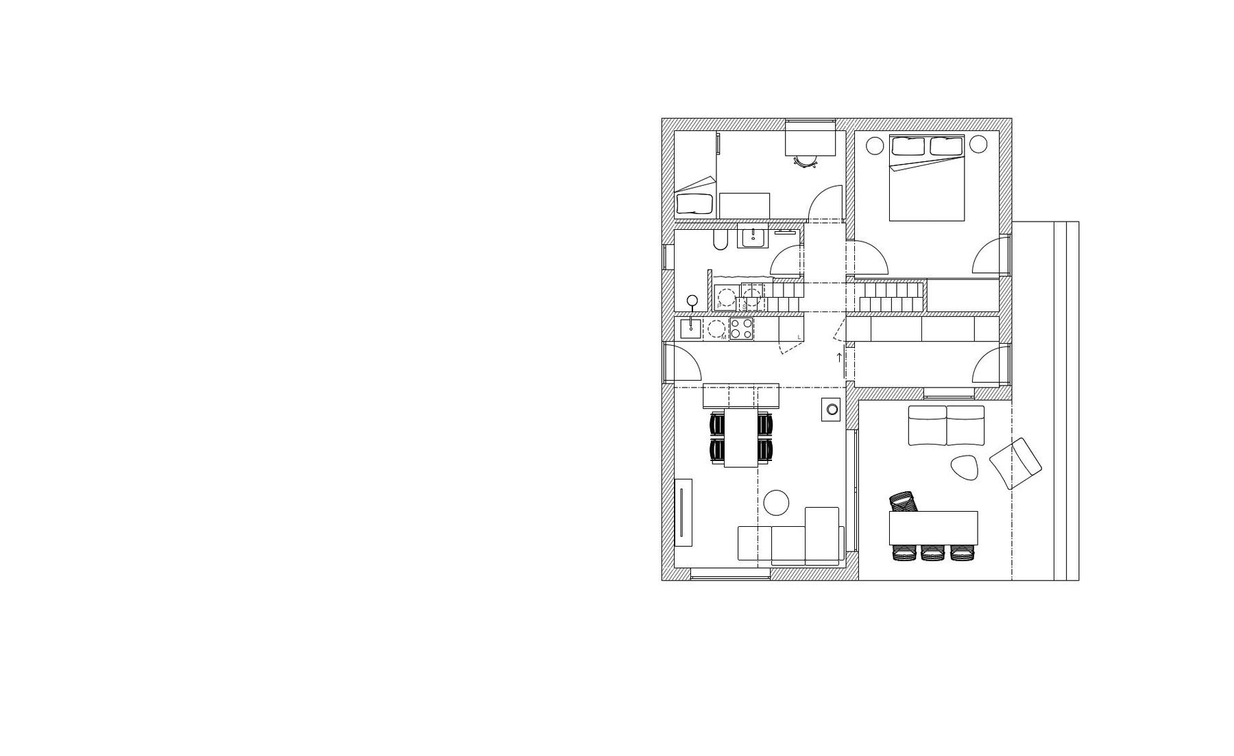řešením a využívá chytré truhlářské vestavby doplněné o pár kusů