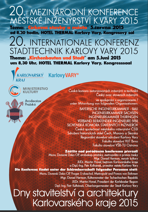 Dne 5. 6. 2015 se v Kongresovém sále hotelu Thermal v Karlových Varech uskuteční letošní jubilejní 20. ročník této konference, která má název Církevní stavby a město. Nad pořádáním celodenní konference převzali záštitu Mons. Dominik Duka, OP – arcibiskup pražský, metropolita a primas český, Mgr. Daniel Herman – ministr kultury, JUDr. Martin Havel – hejtman Karlovarského kraje a Ing. Petr Kulhánek – primátor Karlových Varů.