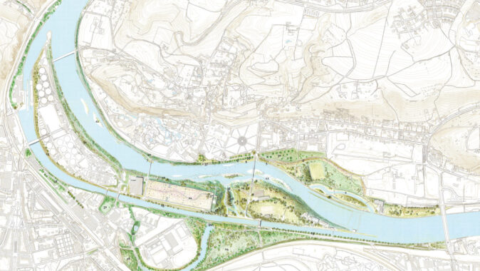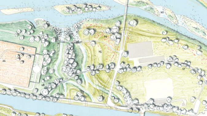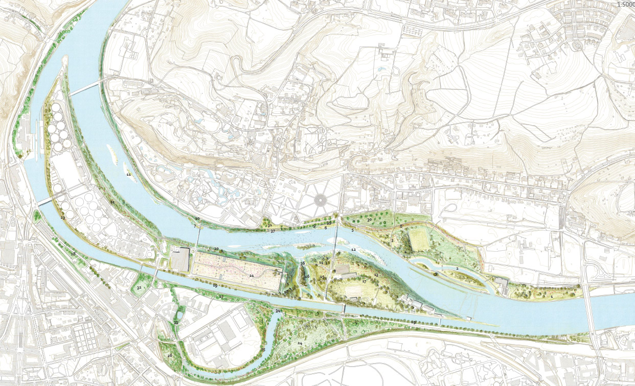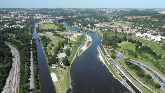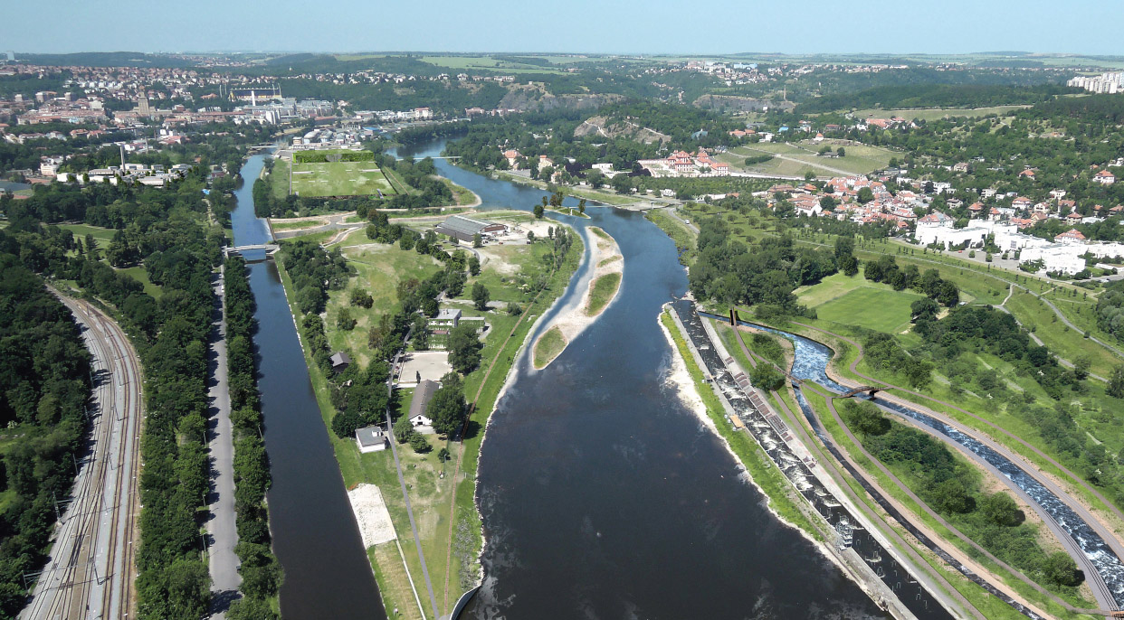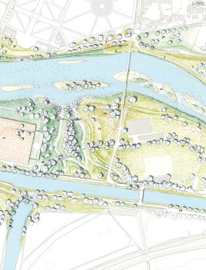 Důležitou součástí zadání bylo i navržení řešení zvýšeného průtoku při povodních, na který má nová vodní linka negativní vliv. Vítězný tým proto navrhuje nové rameno vedoucí napříč ostrovem. To pomáhá přirozeným způsobem odvést vodu do koryta pod jezem.