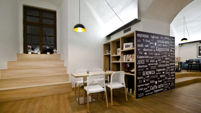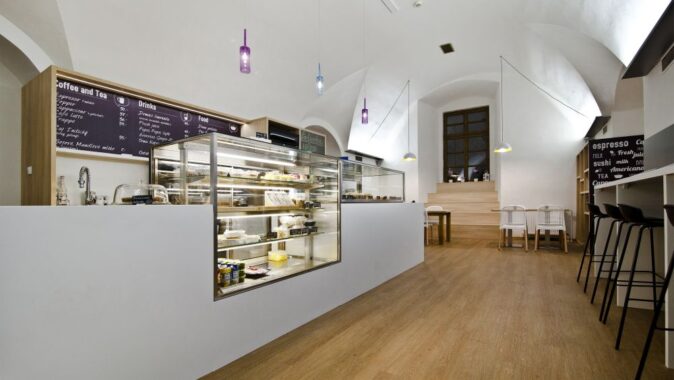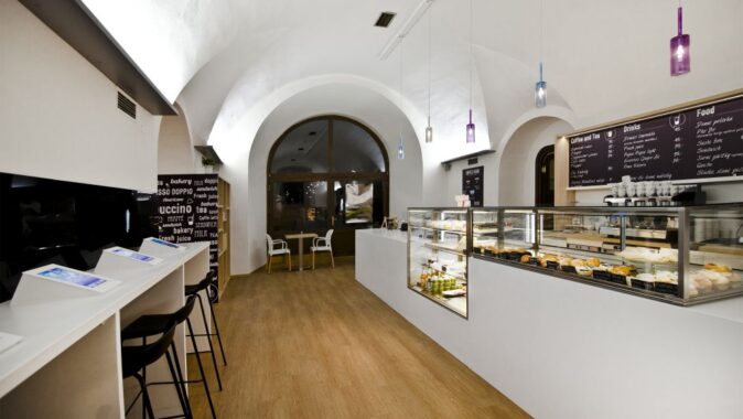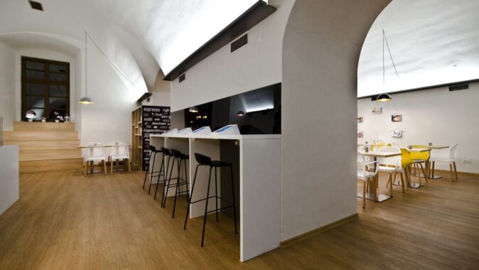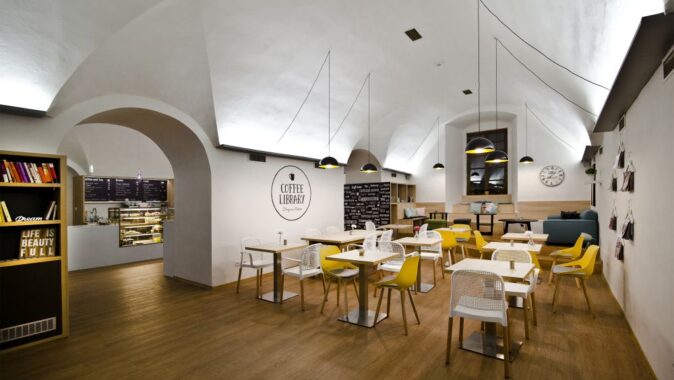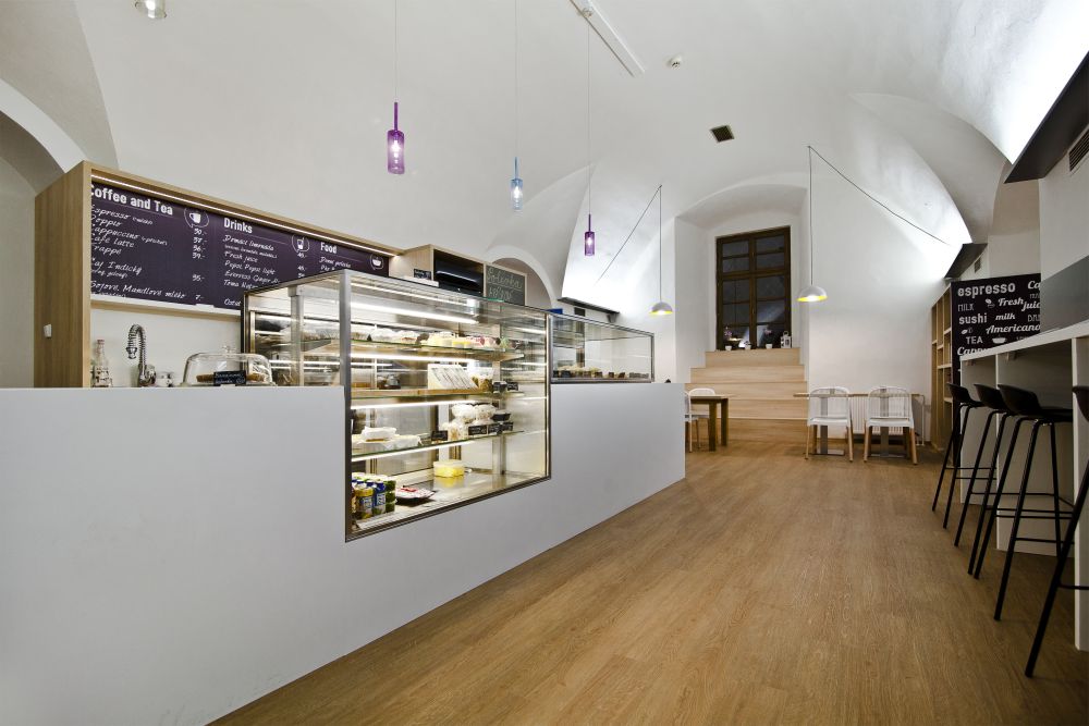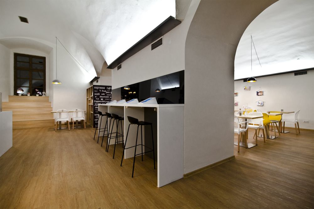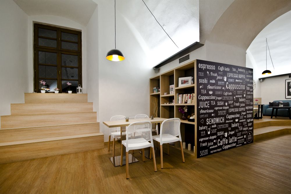 Spojujícím prvkem s náplní budovy byla idea knihovny, která se v areálu stavby nachází. V návrhu interiéru došlo k propojení mladistvého barevného a materiálového řešení s prostředím historické budovy. V logickém navázání na zázemí kuchyně byl pult umístěn do v pořadí druhé místnosti od hlavního vstupu, v tomtéž prostoru jsou volně k dispozici tablety zabudované ve zvýšeném pultu. V první místnosti je kromě nízkého sezení vyhrazená odpočinková zóna na vyvýšeném pódiu i relaxační zóna v pohodlných „ušácích“. Celkem čtyři knihovny obíhají boční stěny mezi místnostmi, kromě drobných dekorací jsou jinak stěny bílé až do plochy kleneb. Klenby jsou nasvíceny v celé ploše led pásky, z technických důvodů je přiznána kabeláž a kotvení závěsných svítidel.
